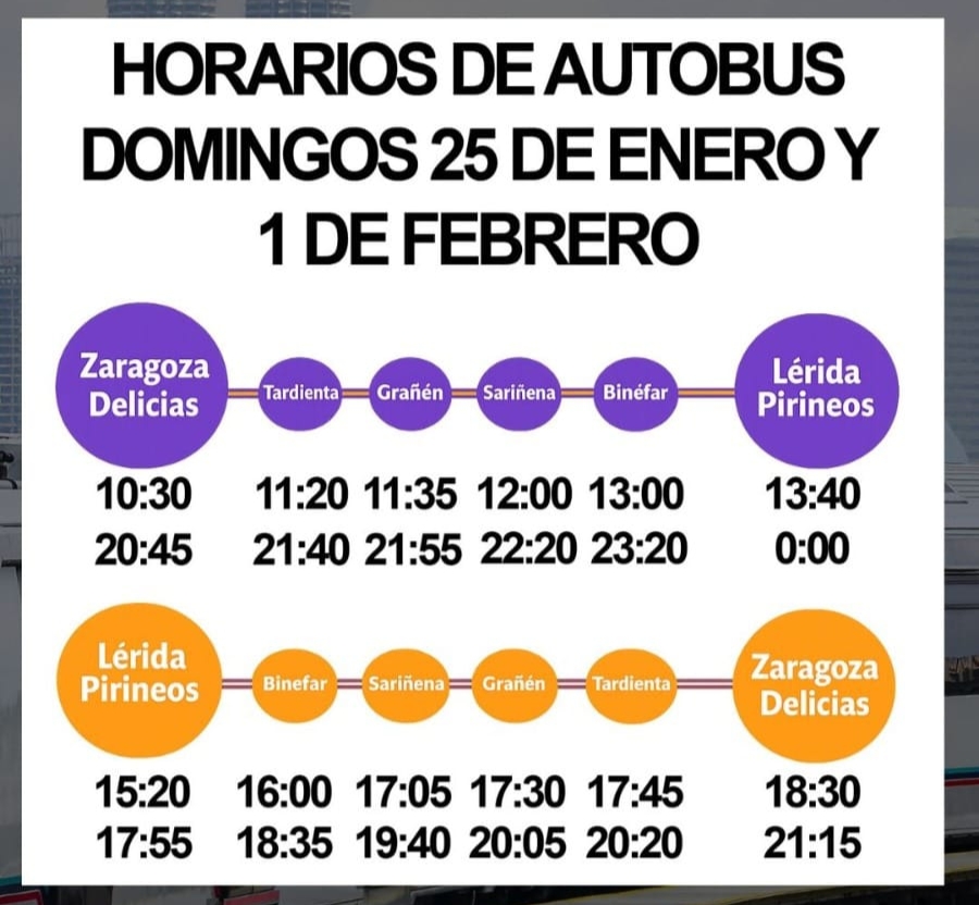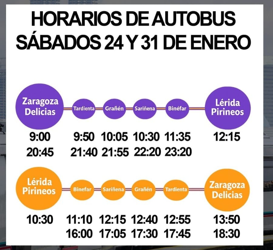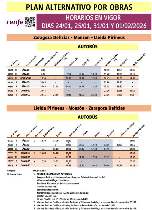 🚌🚧 Con motivo de obras de mejora en la infraestructura ferroviaria, Renfe sustituirá varios servicios de tren por autobuses en el corredor Zaragoza – Monzón – Lleida.
