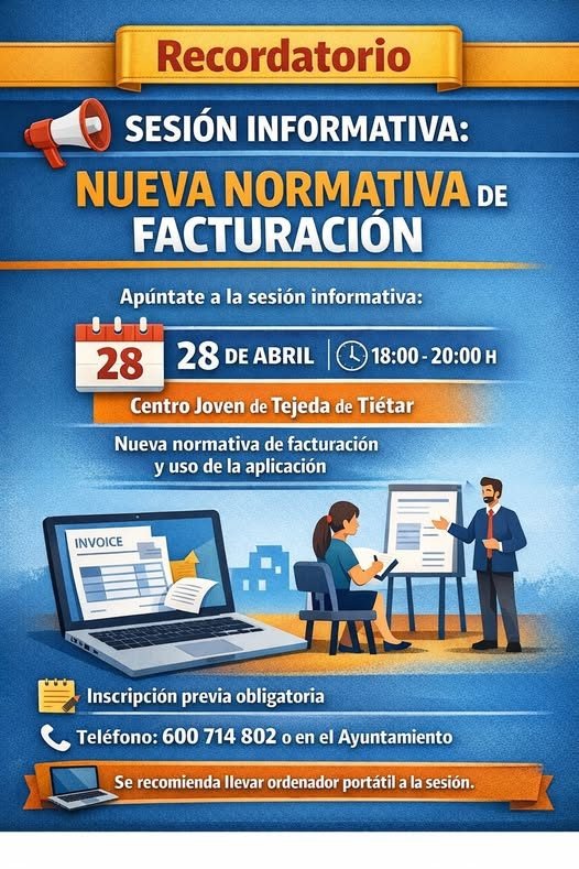 El próximo 28 de abril, de 18:00 a 20:00, tendrá lugar en el Centro Joven de Tejeda de Tiétar una sesión informativa sobre la nueva normativa de facturación para empresas y el uso de la aplicación.