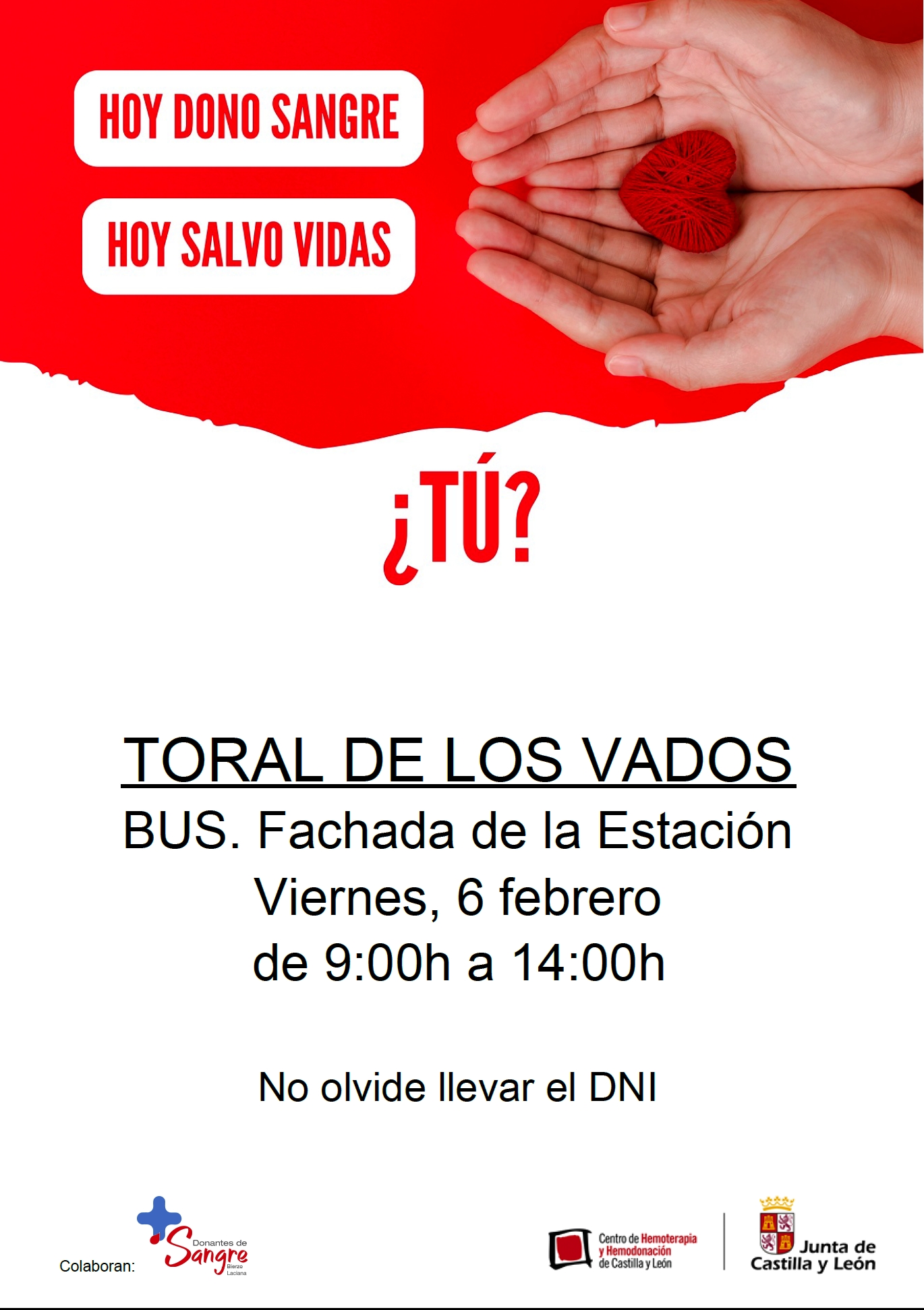 El centro de Hemoterapia y Hemodonación de Castilla y León informa que el próximo VIERNES 6 DE FEBRERO de 2026, entre las 9:00 y las 14:00 horas, estará aparcado su autobús en la plaza de la estación para que todas aquellas personas que lo deseen puedan donar sangre.