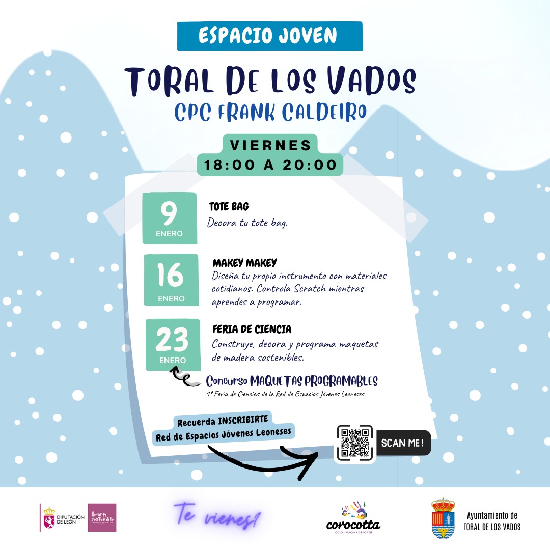 El Espacio Joven de Toral de los Vados, ubicado en el CPC Frank Caldeiro, presenta una nueva programación de actividades dirigida a jóvenes de 12 a 22 años, que se desarrollará durante los meses de enero y febrero.