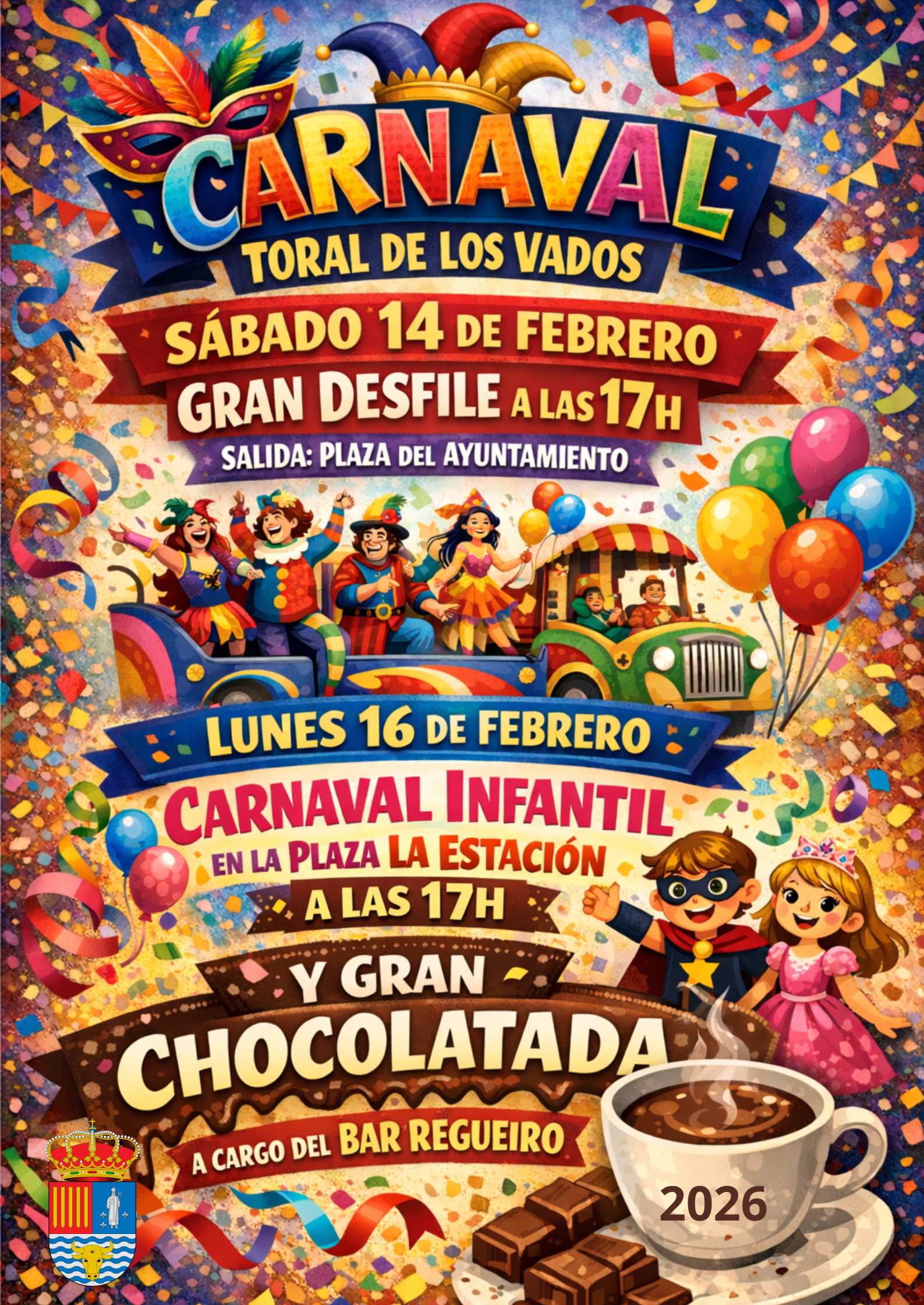 El Ayuntamiento de Toral de los Vados se prepara para recibir el Carnaval 2026 con un amplio abanico de actividades pensadas para todos los públicos. Los días 14 y 16 de Febrero nuestras calles se vestirán de alegría y color para festejar el Carnaval como se merece.