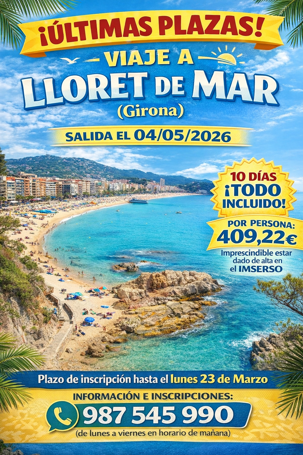 ÚLTIMAS PLAZAS PARA EL VIAJE A LLORET DE MAR (GIRONA) ORGANIZADO POR EL IMSERSO