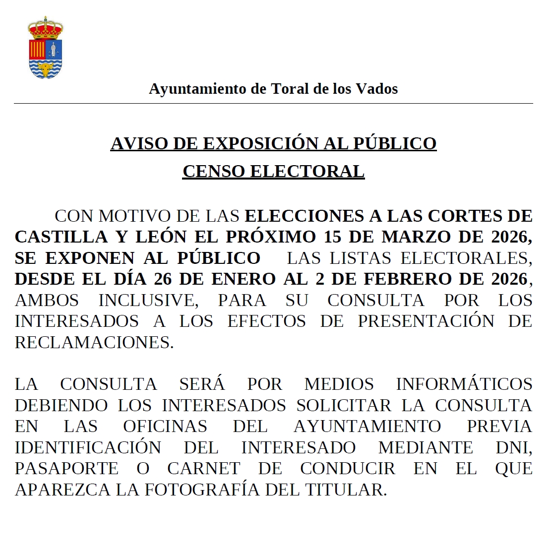 Con motivo de la celebración de las elecciones a las Cortes de Castilla y León, previstas para el 15 de marzo de 2026, se informa a la ciudadanía de que las listas del Censo Electoral permanecerán expuestas al público para su consulta y, en su caso, para la presentación de reclamaciones.