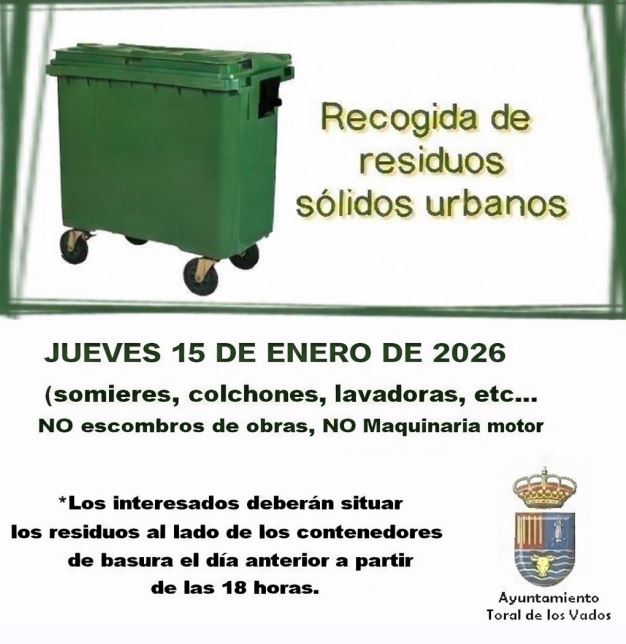La Mancomunidad de Municipios Bierzo Central procederá a la recogida de residuos sólidos urbanos (somieres, colchones, lavadores, ect ... NO escombros de obras, NO maquinaria de motor) en los núcleos del Municipio de Toral de los Vados el JUEVES 13 DE NOVIEMBRE DE 2025.
