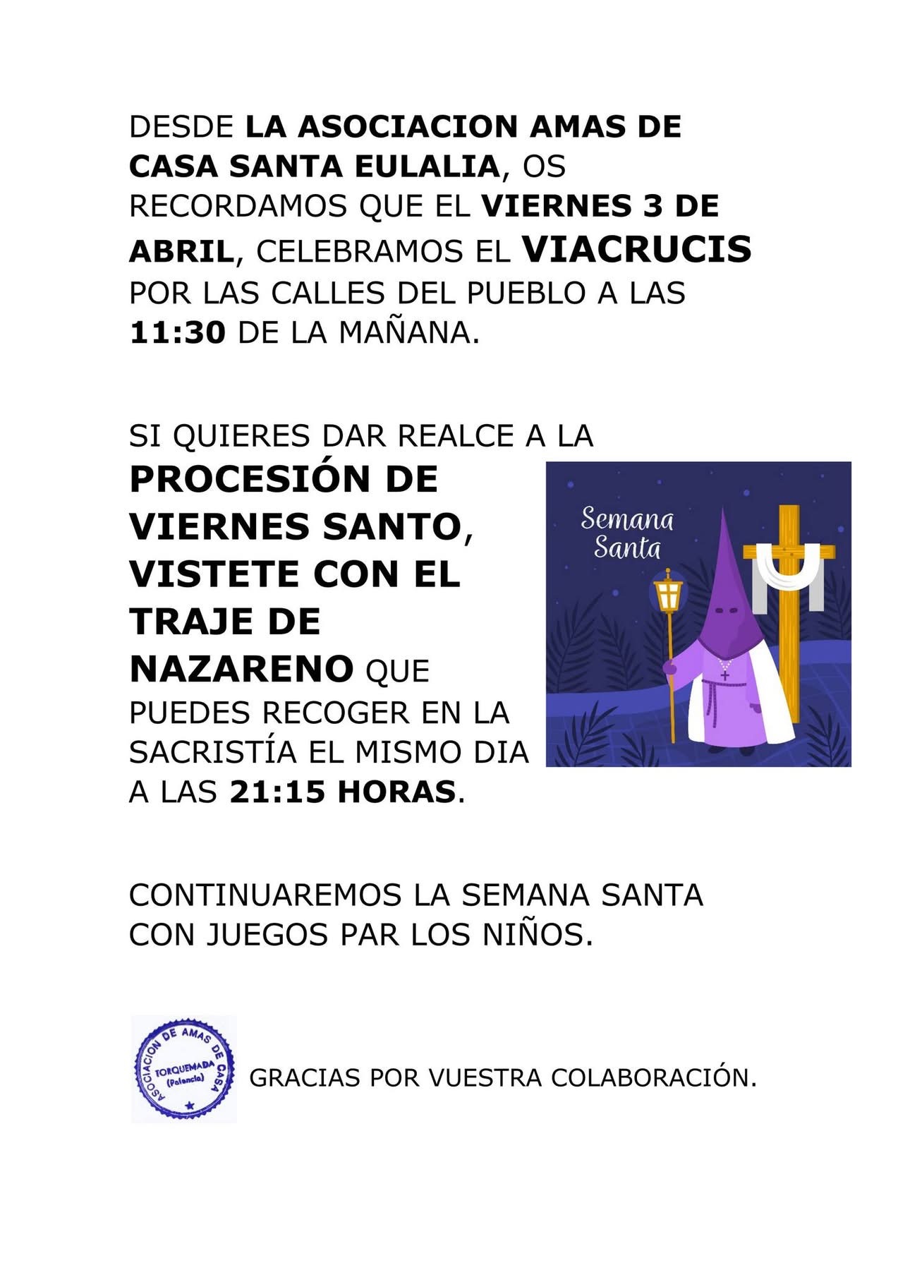 📢 La Asociación Amas de Casa Santa Eulalia invita a participar en las actividades organizadas con motivo de la Semana Santa.