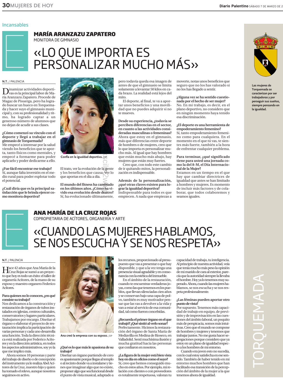 Lo celebramos con la publicación de esta entrevista a dos mujeres que desarrollan su labor en Torquemada, poniendo en valor su trabajo y su experiencia. A través de sus testimonios se refleja el papel fundamental que desempeñan las mujeres en la vida social y laboral de nuestros pueblos. La igualdad real y efectiva entre mujeres y hombres es un principio esencial recogido en la Constitución Española y un objetivo que debe seguir guiando nuestras ac(...)