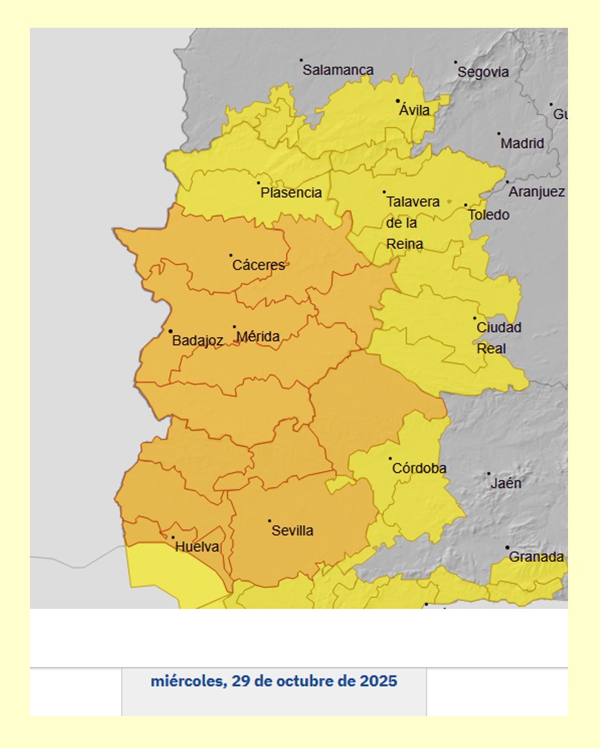 - El Centro de Urgencias y Emergencias 112 Extremadura activará mañana miércoles, día 29, desde las 9:00 hasta las 20:00 horas, la alerta naranja por lluvias en las Vegas del Guadiana y sur de Badajoz y en la Meseta cacereña, donde se espera una precipitación acumulada en una hora de 30 litros por metro cuadrado, según las previsiones de la Agencia Estatal de Meteorología (AEMET).