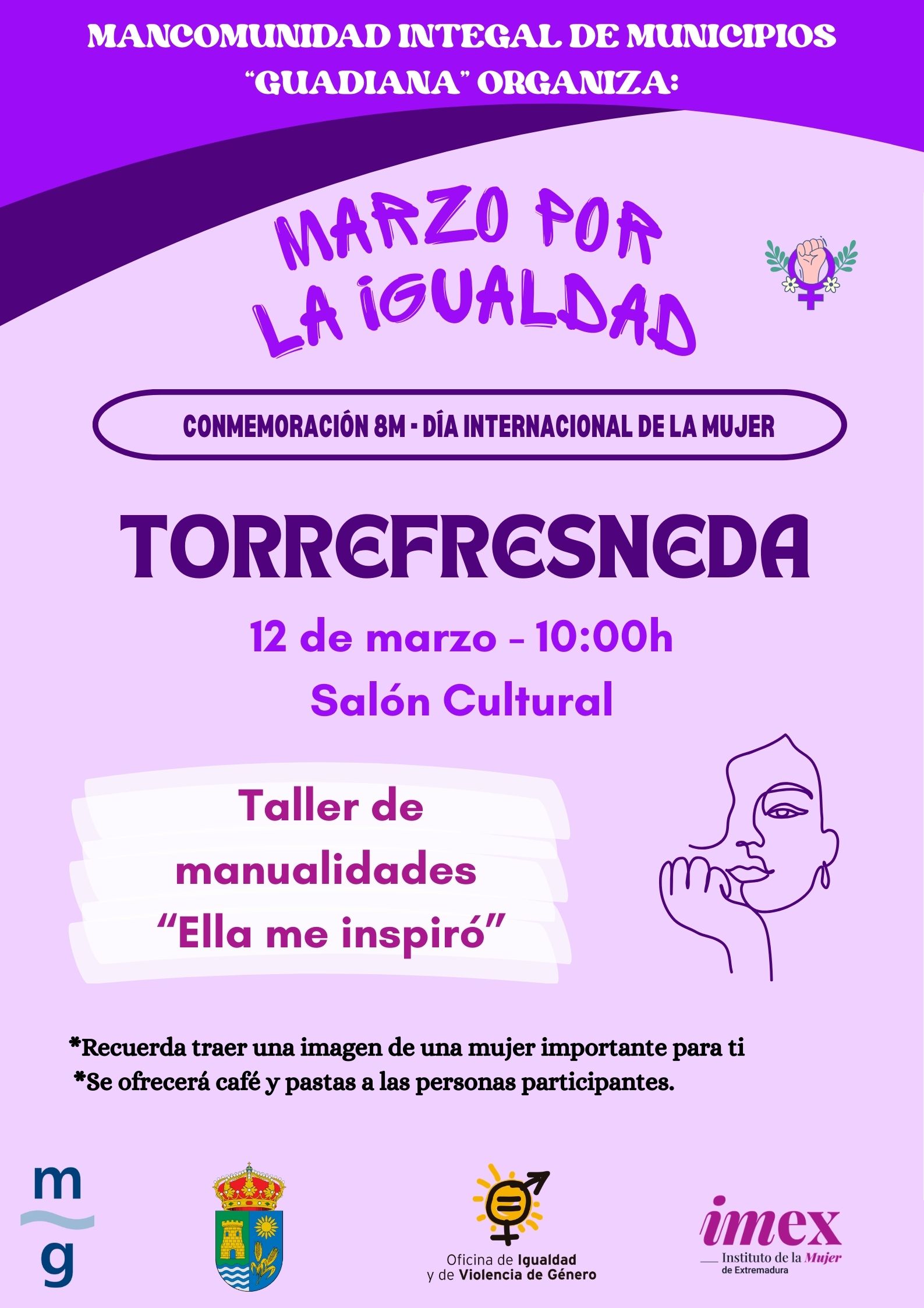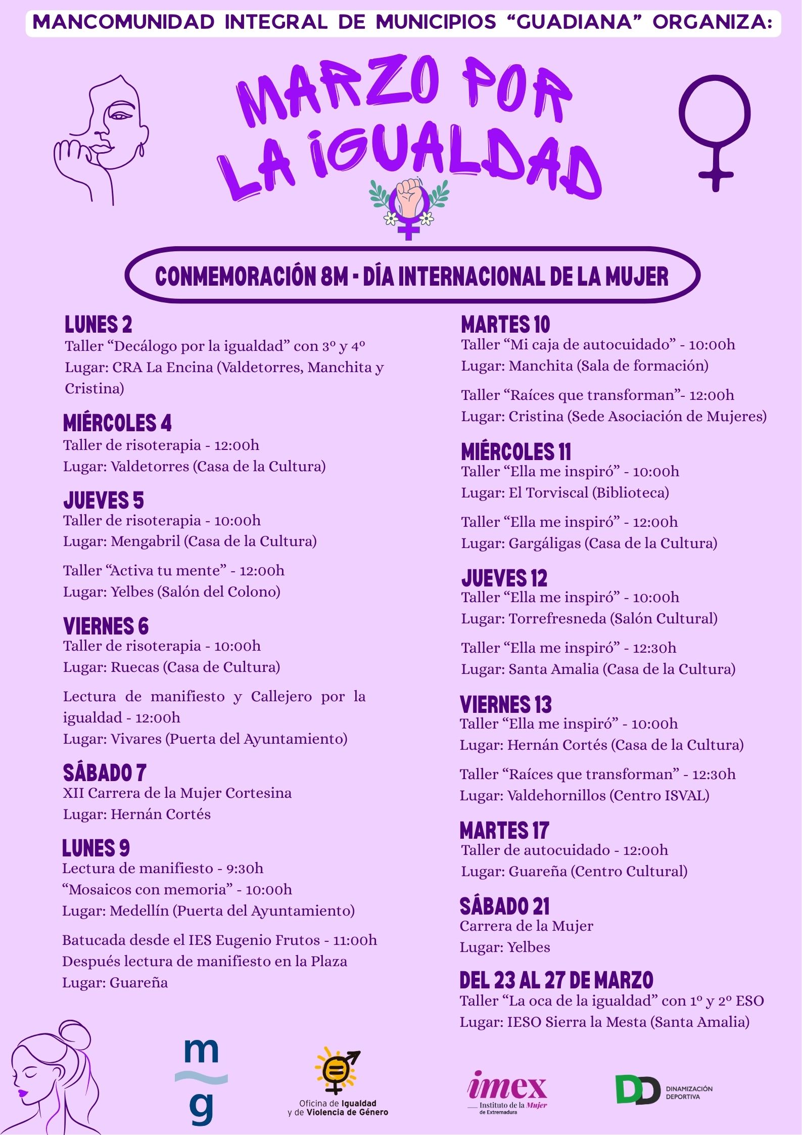 Adjuntamos cartel informativo sobre la actividad que se va a llevar a cabo en nuestra localidad. el día 12 de marzo, con motivo de la celebración del día internacional de la mujer. Dicha actividad está incluida en un programa más amplio que ha sido elaborado por la Mancomunidad Integral de Municipios Guadiana y que se desarrollará durante el mes de marzo por las distintas localidades que la forman.