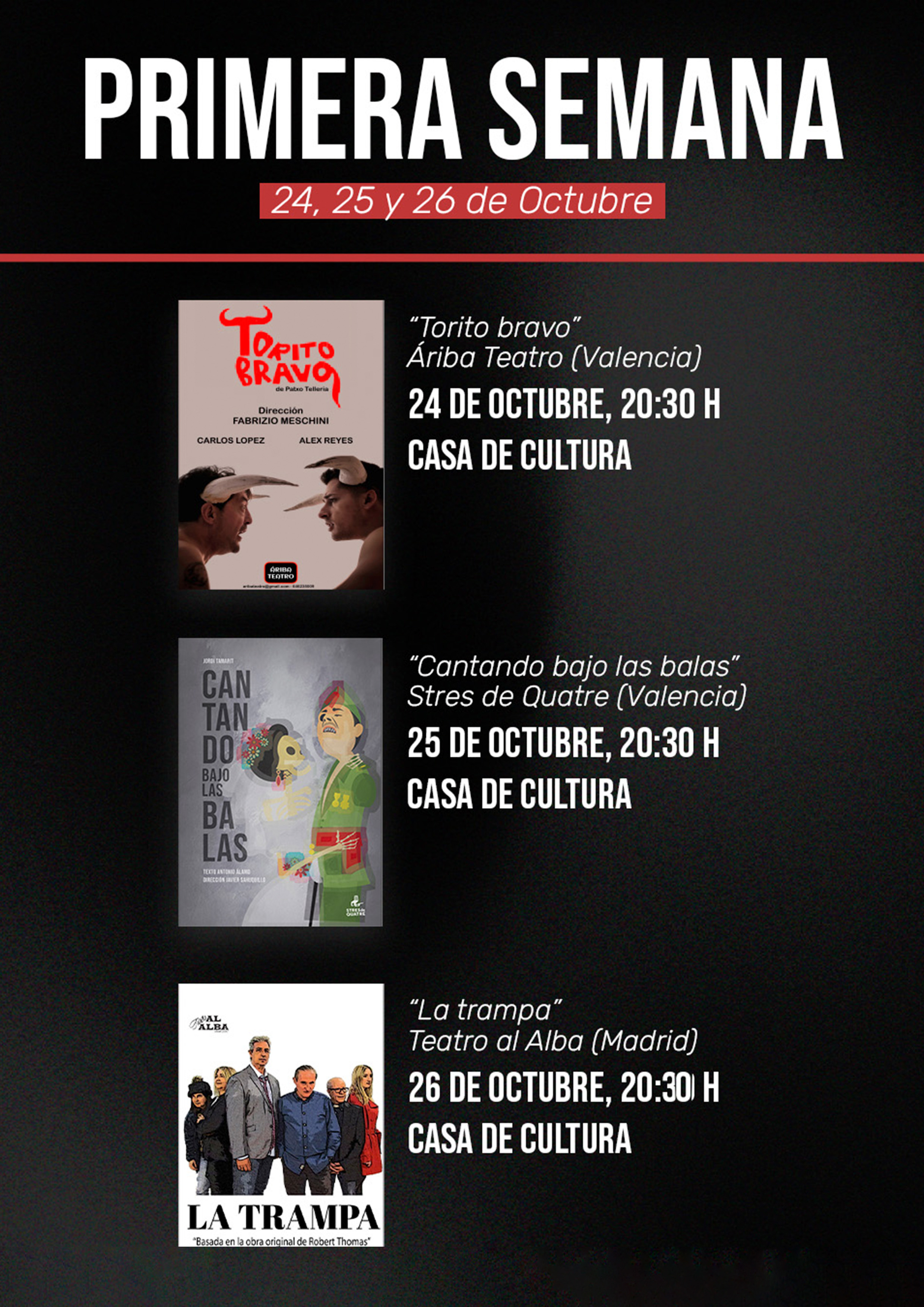 Hoy comenzamos el Certamen Nacional de Teatro Aficionado “Raúl Moreno Molero” en la Casa de Cultura a las 20:30 h.