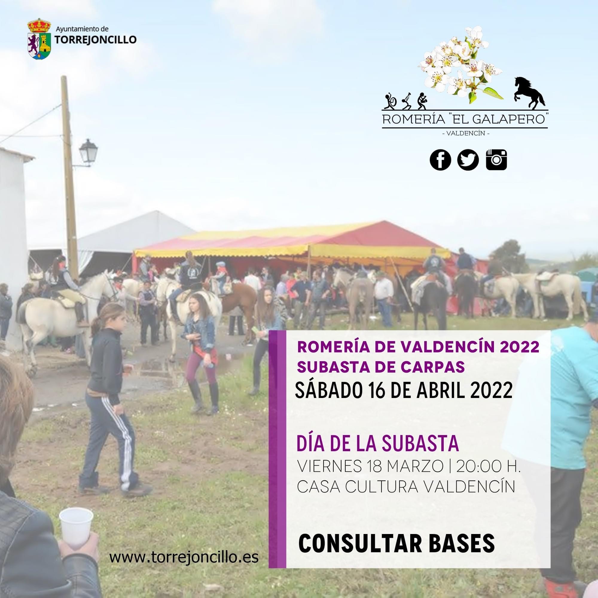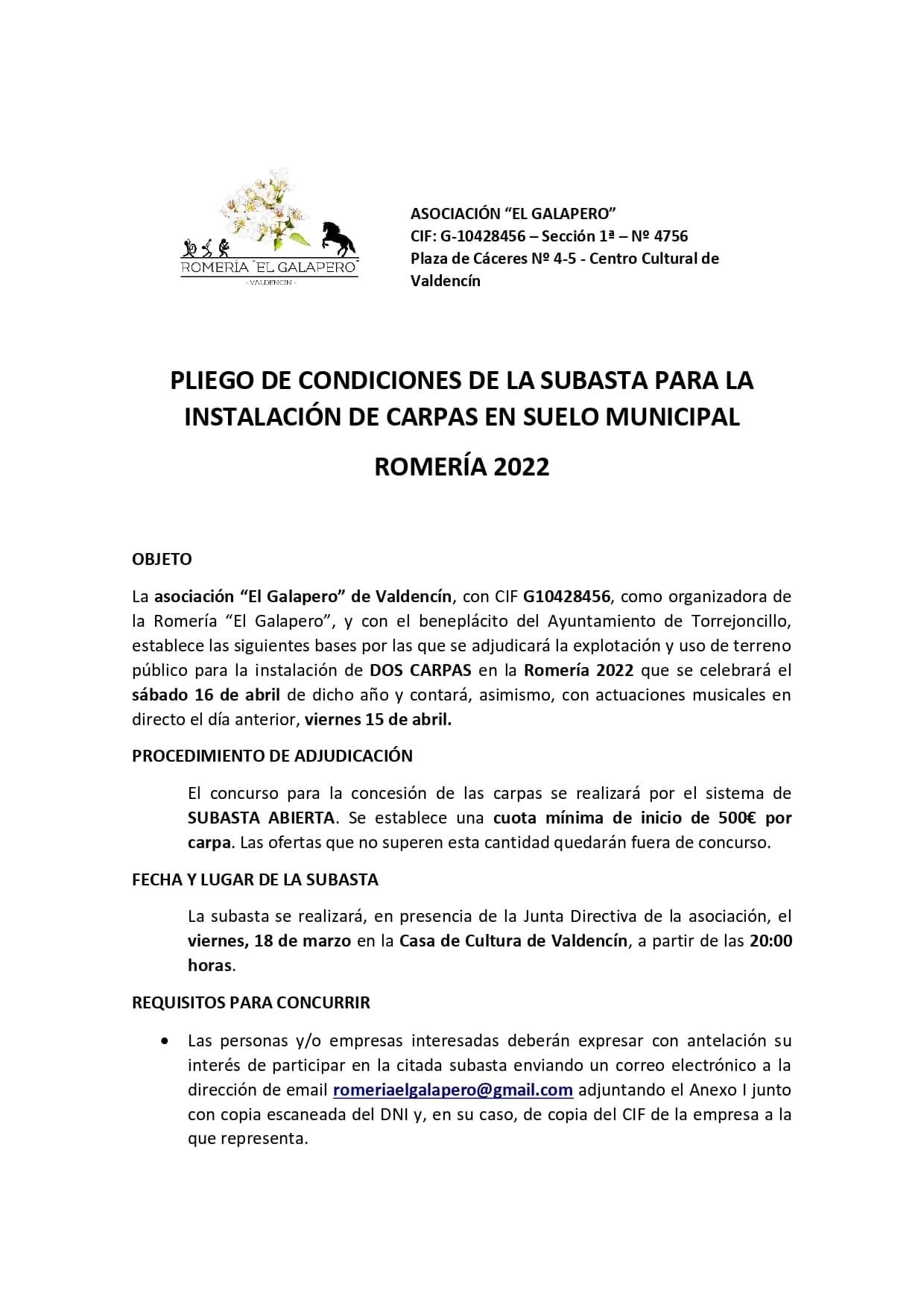 🧑🏽⚖️ SUBASTA CARPAS ROMERÍA DE VALDENCÍN 20222022-03-08 19:10:28General🎪 La Asociación Romería El Galapero - Valdencín ha publicado el Pliego de Condiciones de la Subasta para la Instalación de Carpas en Suelo Municipal con motivo de la Romería de Valdencín 2022.