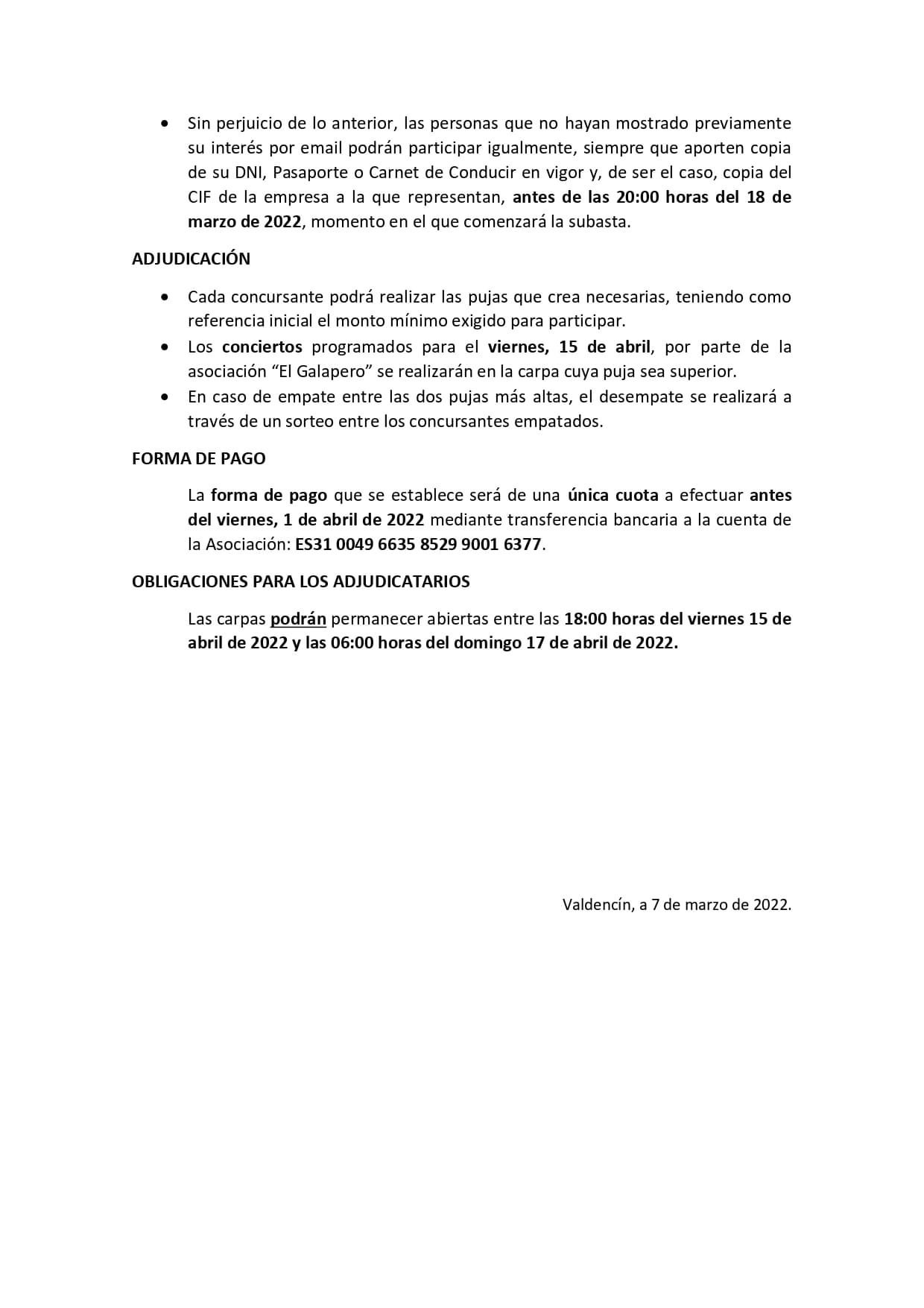 - Los conciertos programados para el viernes, 15 de abril, por parte de la asociación “El Galapero” se realizarán en la carpa cuya puja sea superior.