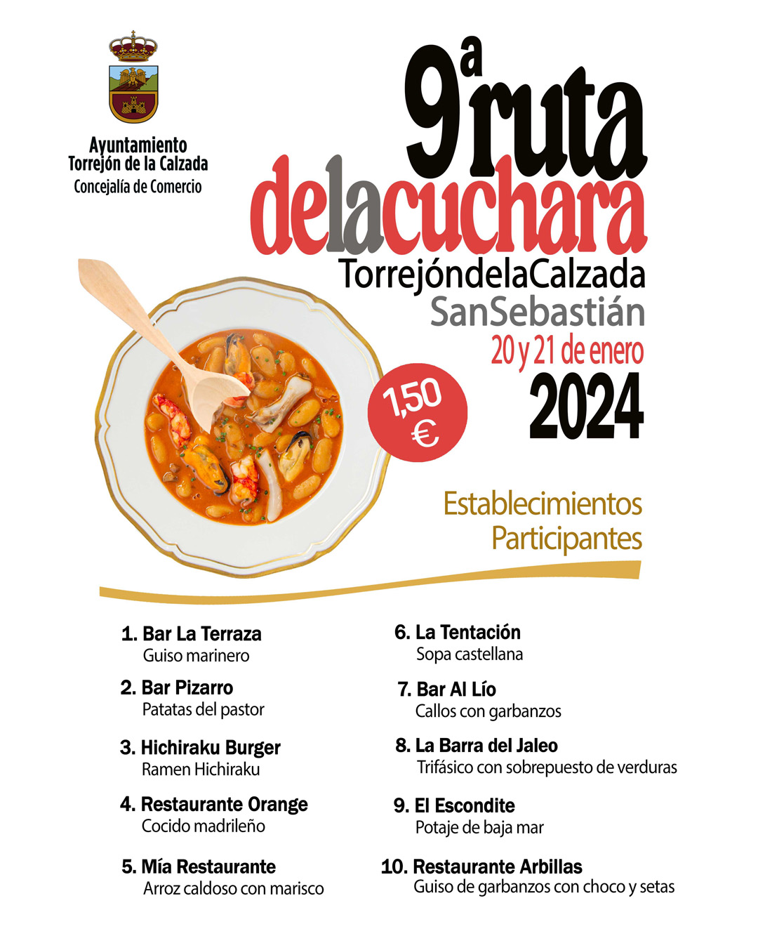 9º RUTA DE LA CUCHARA.2024-01-17 13:00:00COMERCIOCon motivo de la festividad de San Sebastián, durante este fin de semana tendrá lugar la 9º Ruta de la cuchara.