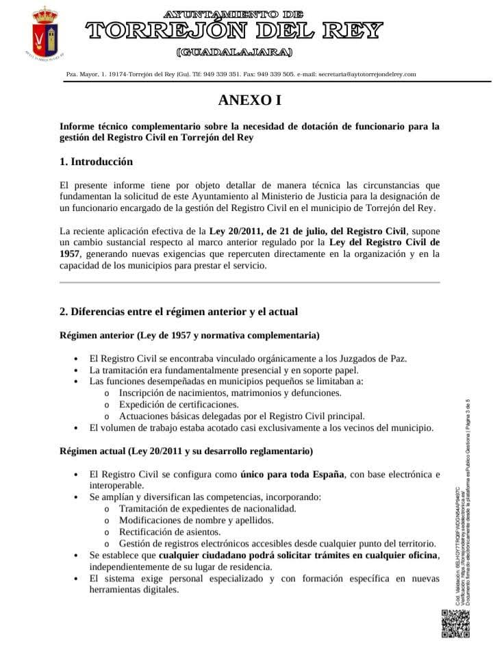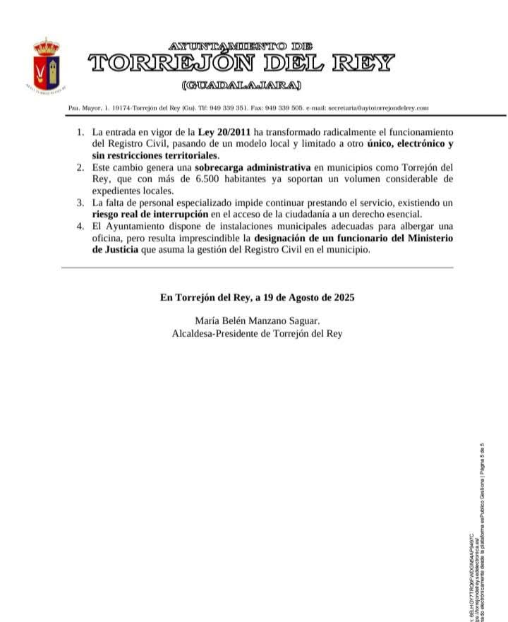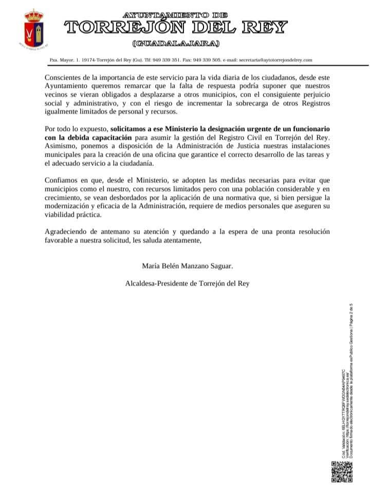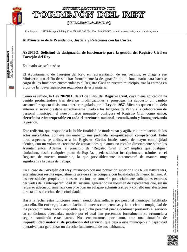 Desde el Ayuntamiento de Torrejón del Rey queremos informar a todos los vecinos que hemos remitido una solicitud formal al Ministerio de Justicia para que se designe un funcionario responsable del Registro Civil en nuestro municipio.