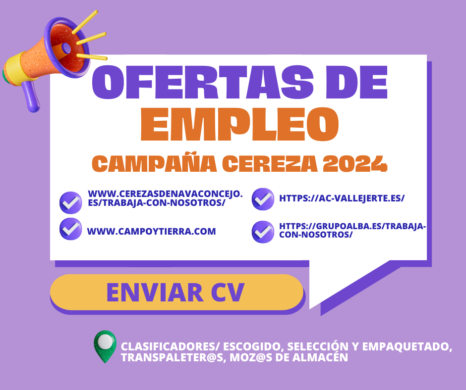 Ya pueden apuntarse en la cooperativa para trabajar en campañahttps://correoeell.dip-caceres.es/img/zimbra/1x1-trans.png" height="16">https://correoeell.dip-caceres.es/img/zimbra/1x1-trans.png" height="16">: CLASIFICADOR@S, ESCOGIDO Y SELECCIÓN PARA CINTA, TANTO PARA ESCOGIDO y CALIBRADO MANUAL, MANTENIMIENTO MAQUINARIA, CALIBRADO Y EMPAQUETADO, TRANSPALETER@S, MOZOS ALMACÉN, …..