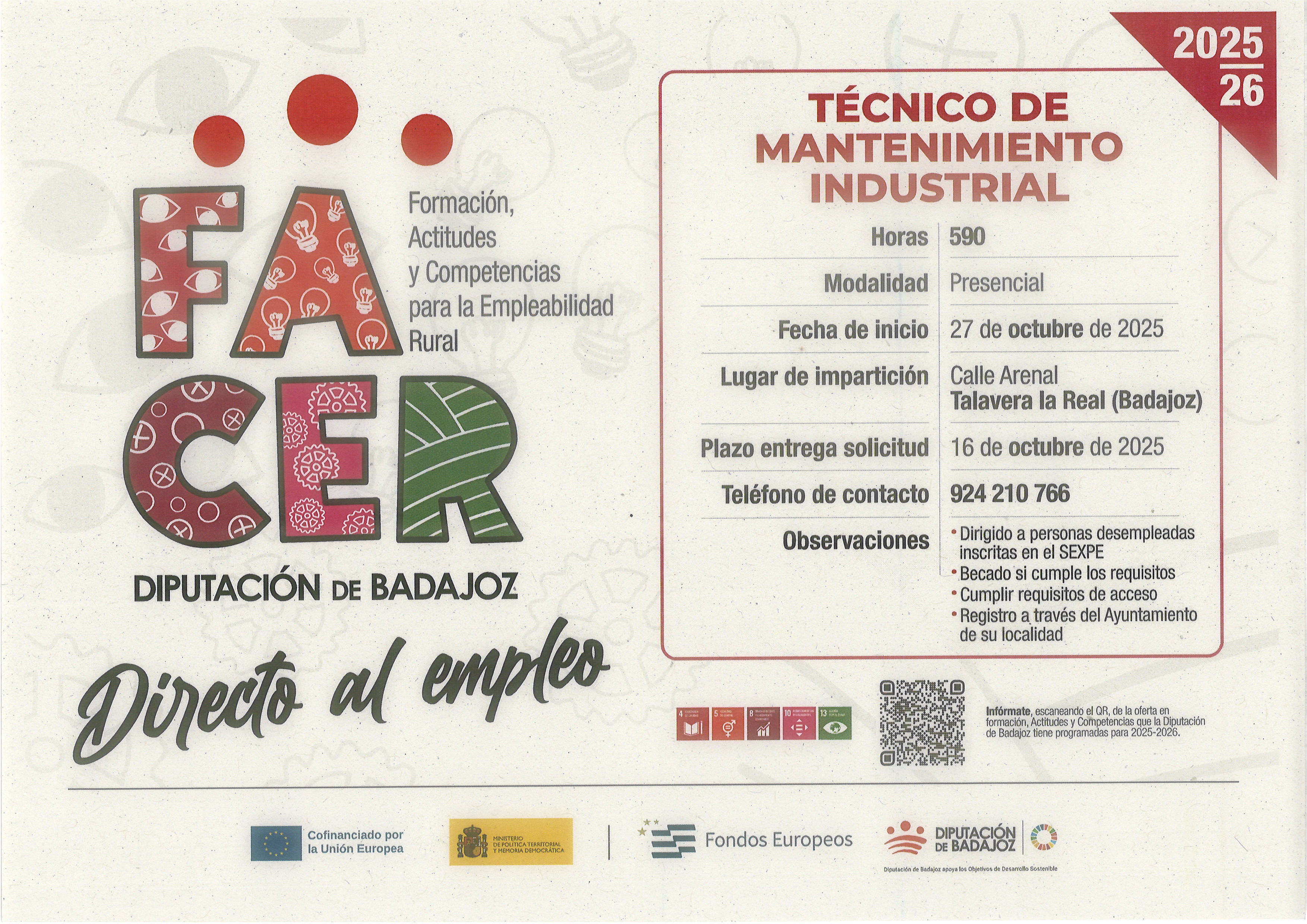 El curso irá destinado de manera preferente al alumnado de las localidades del ámbito CID VEGAS BAJAS (Esparragalejo, Guadiana, La Garrovilla, Lobón, Montijo, Puebla de la Calzada, Pueblonuevo del Guadiana, Talavera la Real, Torremayor y Valdelacalzada), aunque podrá solicitar inscripción cualquier persona residente en cualquier municipio de la provincia de Badajoz. Este curso se impar(...)