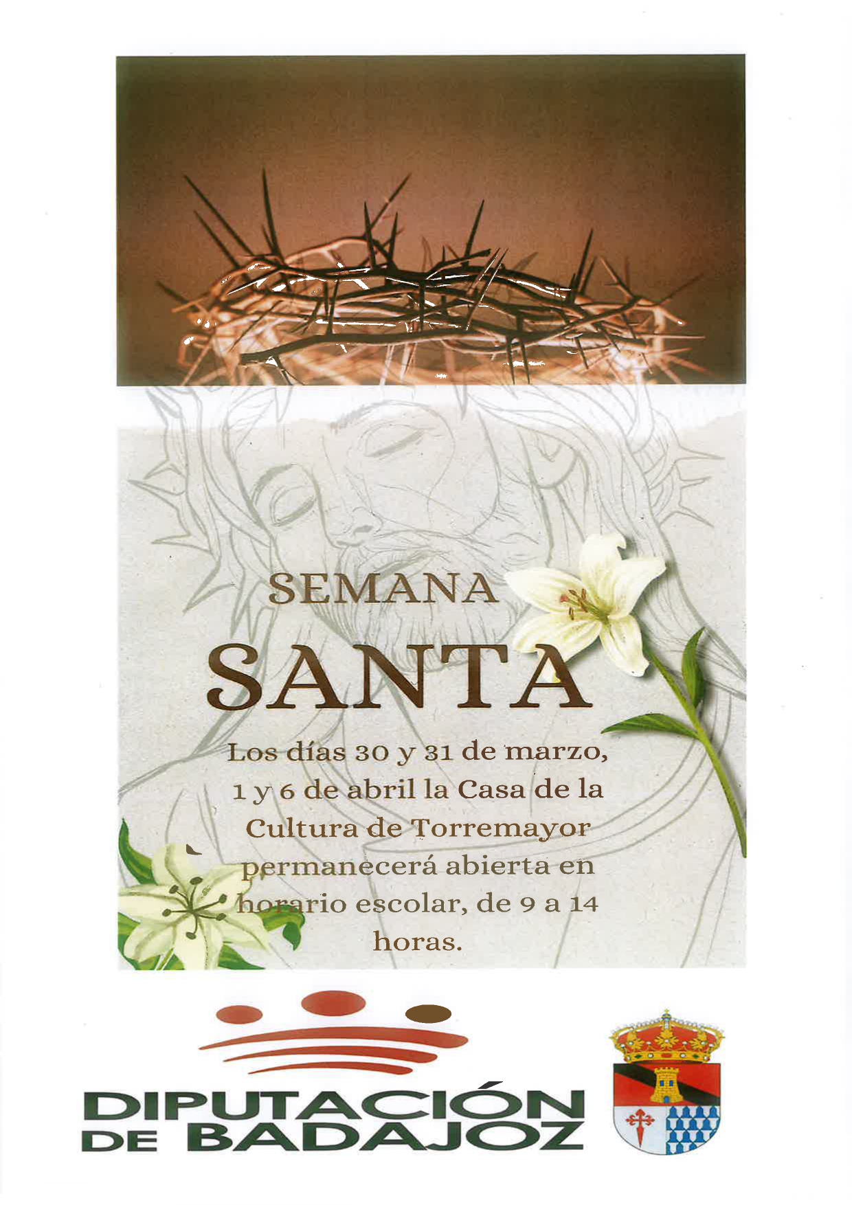 Con motivo de la festividad de Semana Santa y con el objetivo de favorecer la conciliación familiar, la Casa de la Cultura de Torremayor estará abierta en horario escolar los días 30 y 31 de marzo y 1 y 6 de abril.