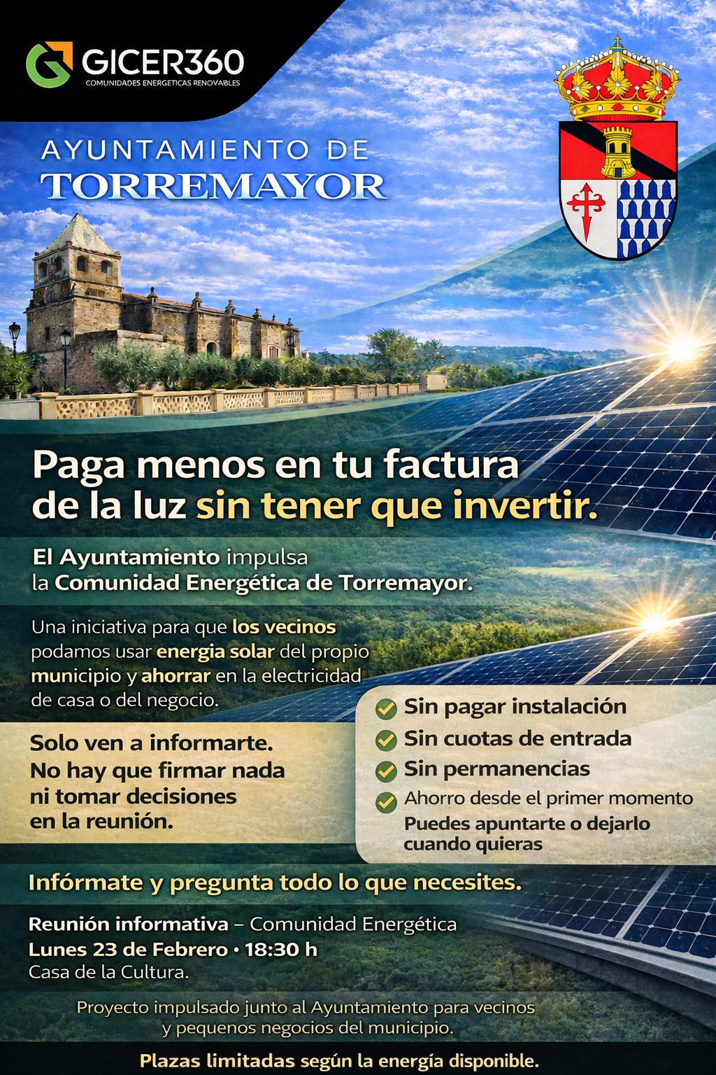 SE INFORMA A LOS VECINOS/AS DE TORREMAYOR QUE EL DIA 23 DE FEBRERO A LAS 18:30 HORAS TENDRÁ LUGAR EN LA CASA DE LA CULTURA UNA REUNIÓN INFORMATIVA SOBRE EL PROYECTO DE COMUNIDAD ENERGETICA QUE EL AYUNTAMIENTO JUNTO A LA EMPRESA GICER360 PRETENDEN LLEVAR A CABO.