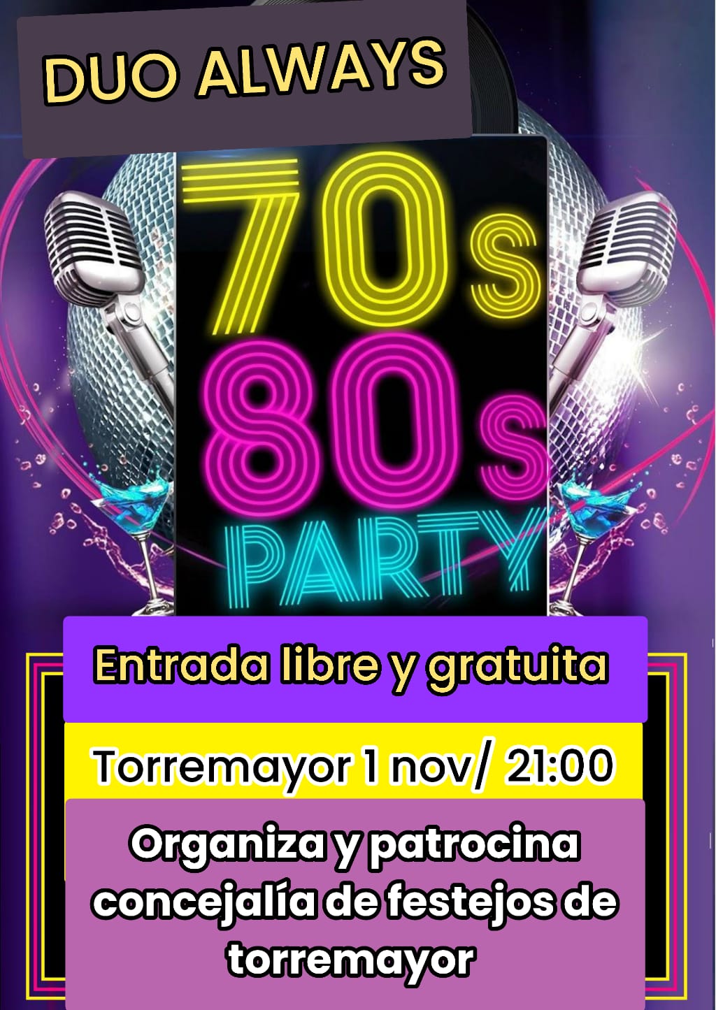 SE COMUNICA A TODO/AS LOS VECINOS/AS , QUE EL PROXIMO DIA 1 DE NOVIEMBRE A PARTIR DE LAS 21:00 HASTA LAS 01:00 HORAS, CON MOTIVO DE LA FINALIZACION DEL LOCAL MULTIUSOS(ANTIGUA NAVE DE LOS CUADROS) Y COINCIDIENDO CON EL DIA DE TODOS LOS SANTOS,DESDE LA CONCEJALIA DE FESTEJOS ,SE HA PROGRAMADO LA ACTUACION DEL DUO ALWAYS QUE AMENIZARA LA NOCHE CON MUSICA DE LOS 70´Y 80´ SIENDO LA ENTRADA LIBRE Y GRATUITA PARA TODOS VECINOS Y VISITANTES,ADEMAS (...)