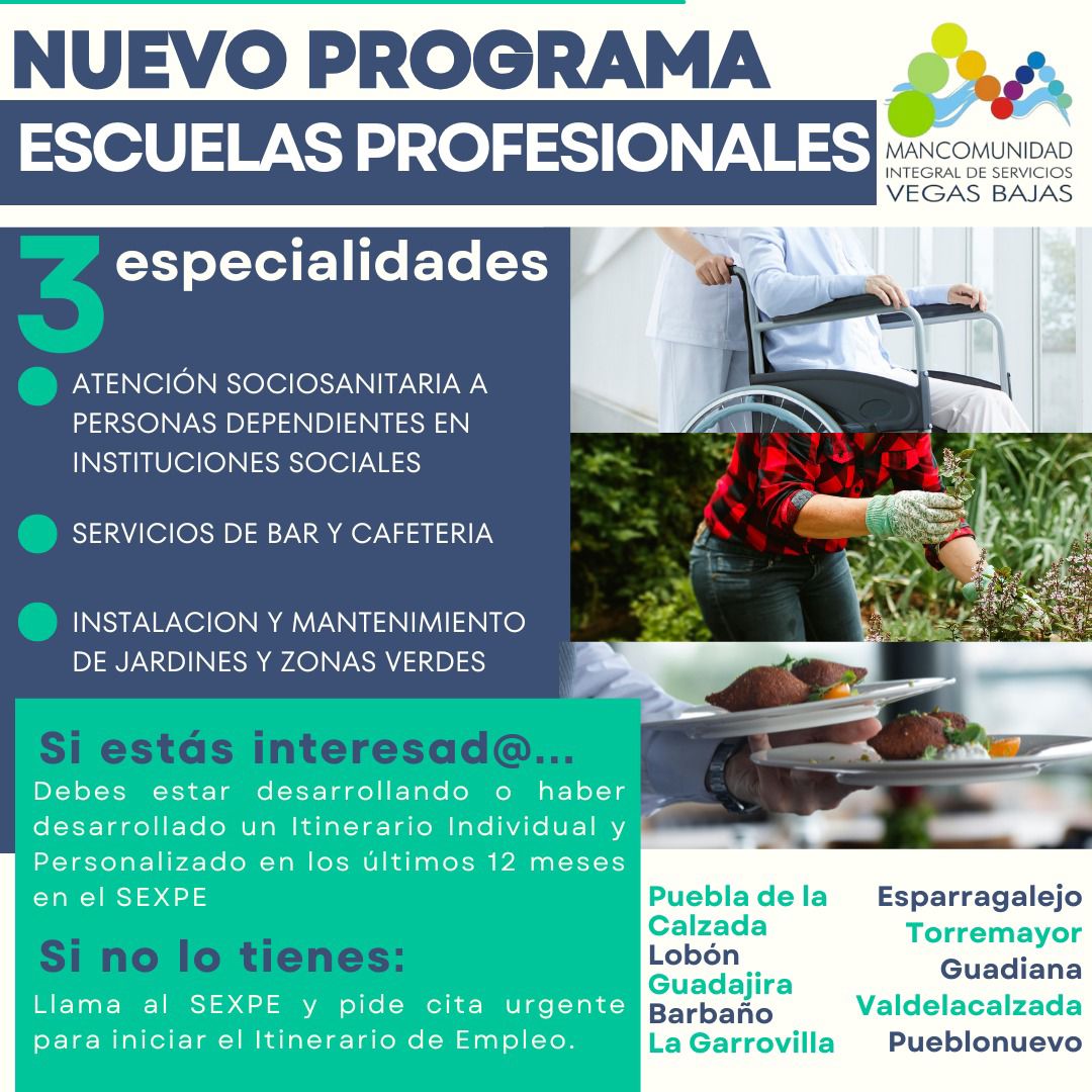Desde el Ayuntamiento de Torremayor informamos del Nuevo Programa de Escuelas Profesionales, que cuenta con tres nuevas especialidades: