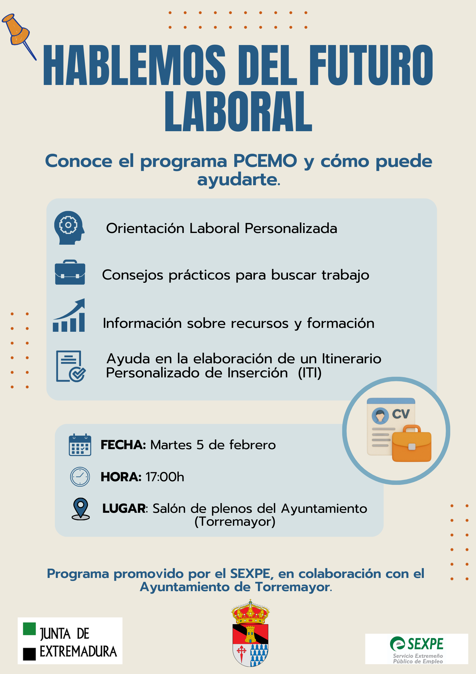📢 Desde el programa PCEMO (Programa de Orientación Laboral), junto al Ayuntamiento de Torremayor y el SEXPE, se invita a la población a la próxima reunión: