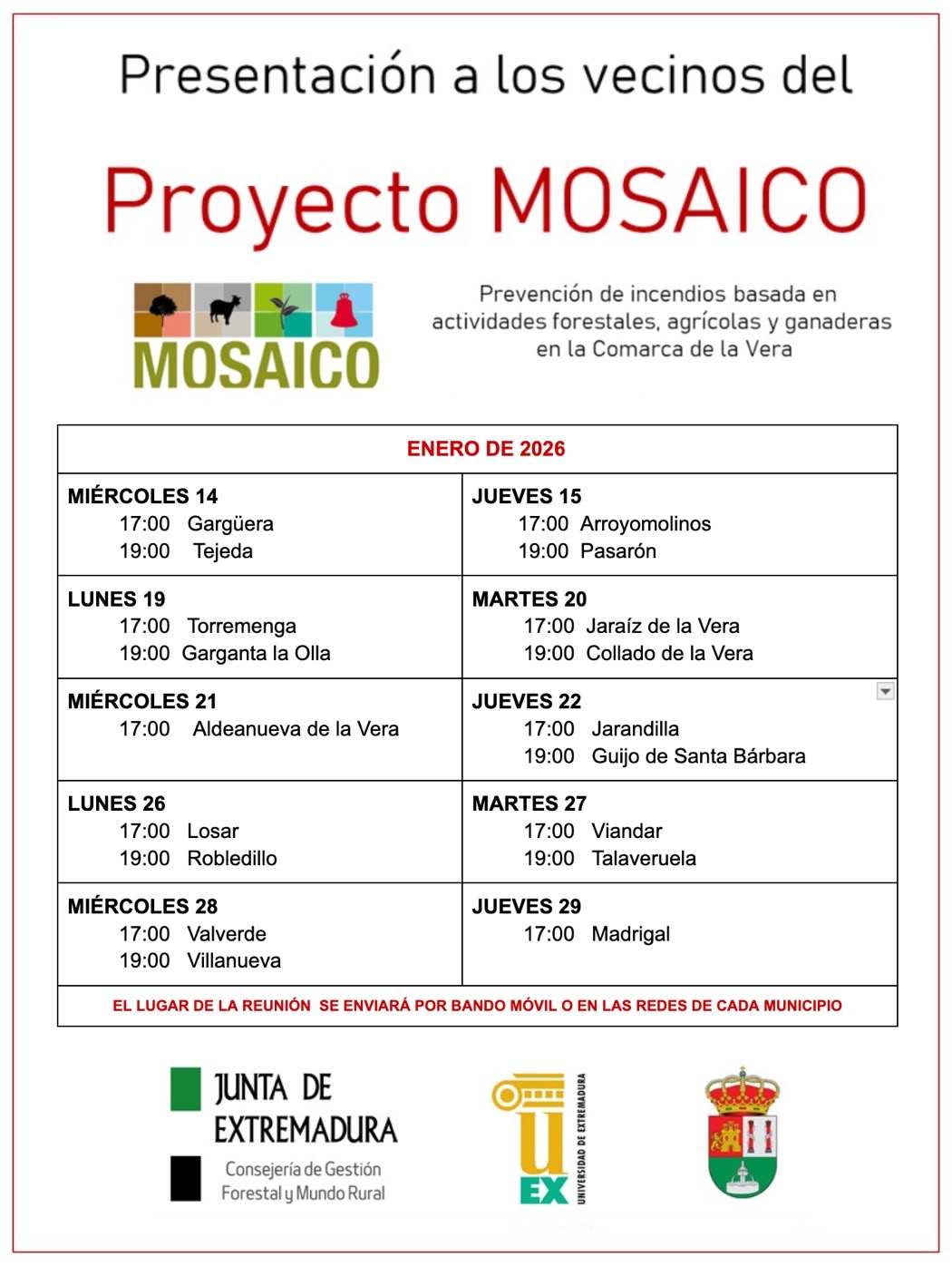 PROYECTO MOSAICO2026-01-09 11:30:20Info GeneralEl día 19 de enero a las 17:00 (5 de la tarde) en el salón de actos de la Casa de la Cultura habrá una reunión para la presentación a los vecinos del Proyecto Mosaico (Prevención de Incendios basada en Actividades Forestales, Agrícolas y Ganaderas).