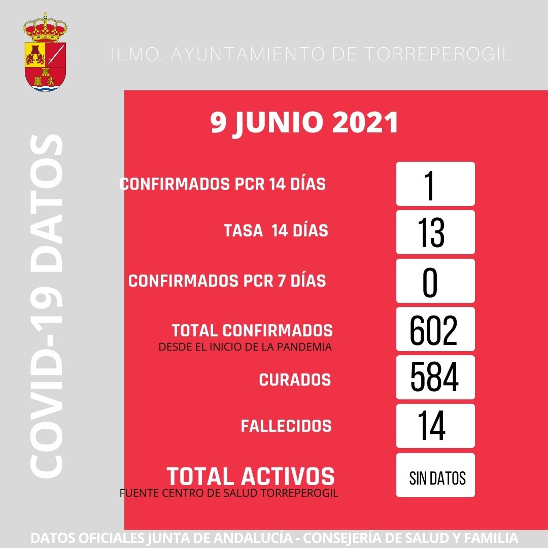 Datos actualizados de la incidencia de la Covid 19 en Torreperogil hoy miércoles 9 de junio ofrecidos por el Centro de Salud y la Junta de Andalucía.