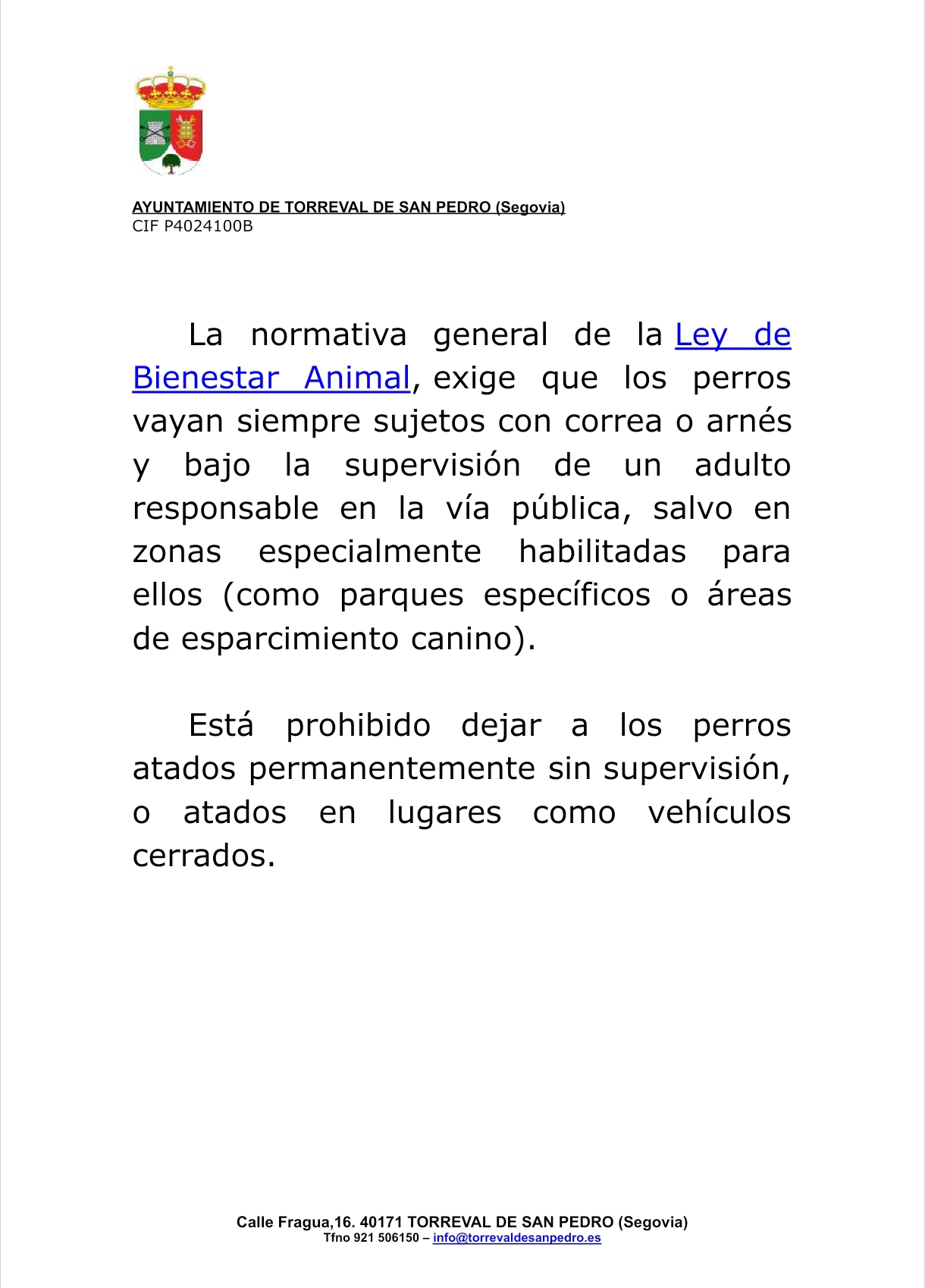 La normativa general de la Ley de Bienestar Animal, exige que los perros vayan siempre sujetos con correa o arnés y bajo la supervisión de un adulto responsable en la vía pública, salvo en zonas especialmente habilitadas para ellos (como parques específicos o áreas de esparcimiento canino).