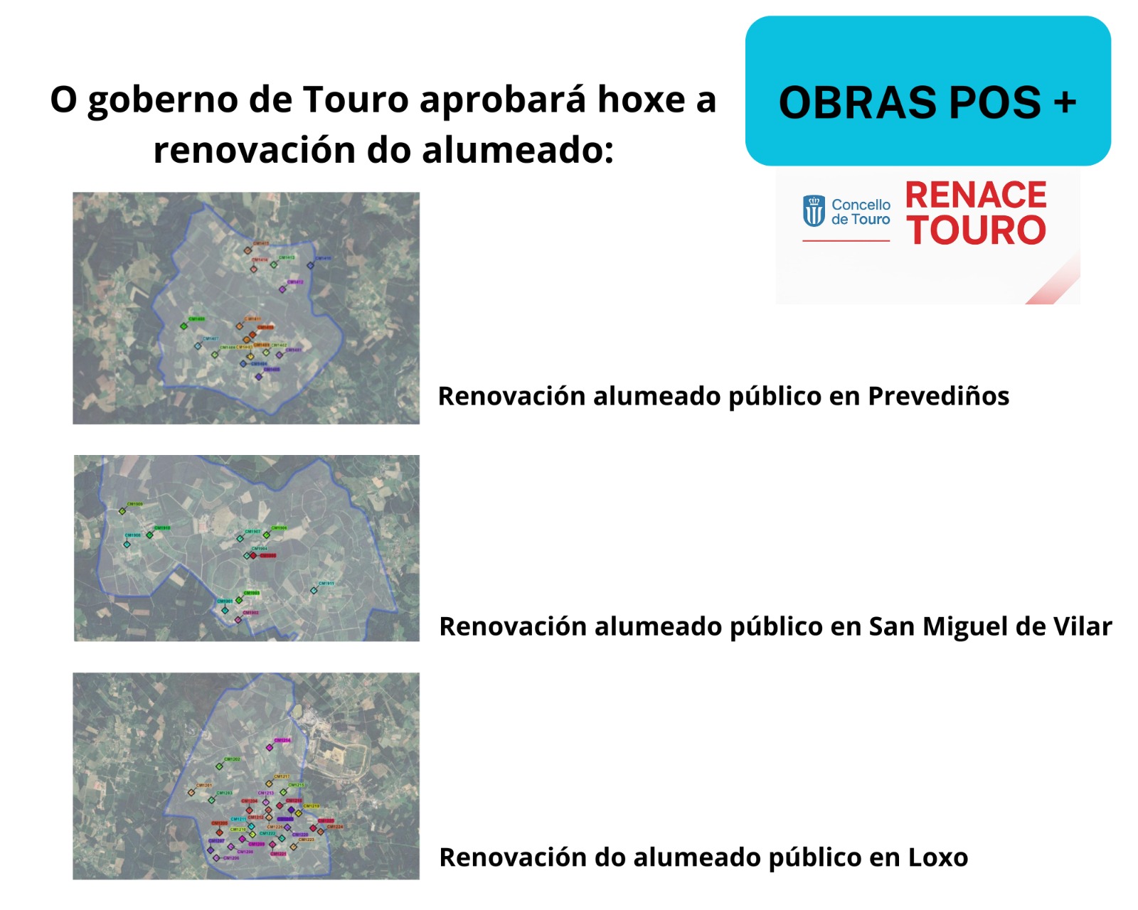 O goberno municipal de Touro aprobará no pleno extraordinario de hoxe, xoves 5 de febreiro, que terá lugar ás 21 horas, a renovación do alumeado público nas parroquias de Prevediños, San Miguel de Vilar e Loxo. Estas actuacións incluiranse no programa POS da Deputación da Coruña.