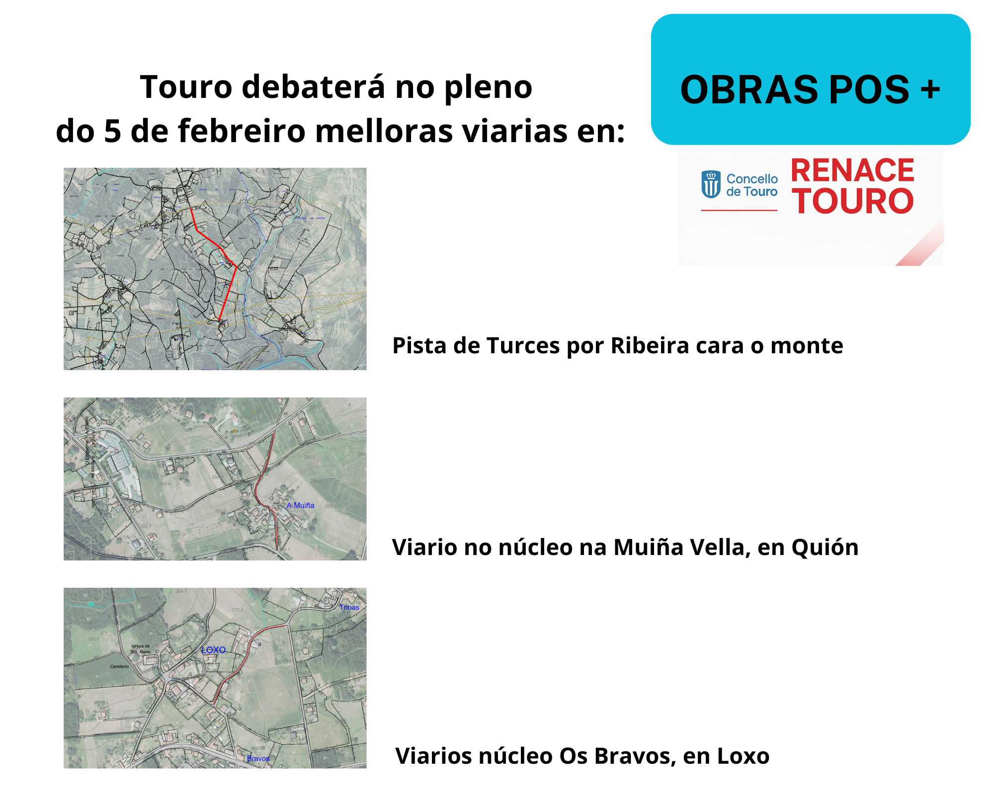 O goberno municipal de Touro aprobará no pleno extraordinario de hoxe, xoves 5 de febreiro, que será ás 21 horas, distintas actuacións, dentro do programa POS da Deputación da Coruña. Entre elas, figuran melloras viarias de Turces por Ribeira, en Quión e Loxo.