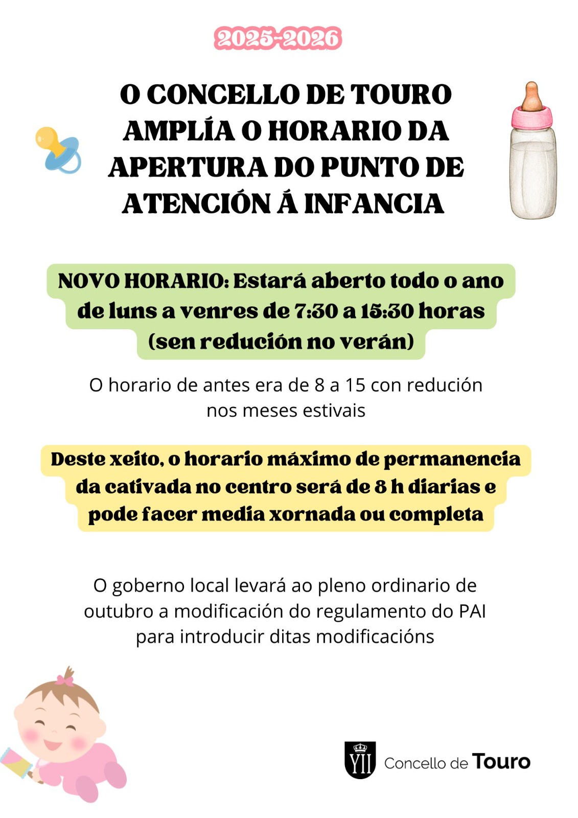 O CONCELLO DE TOURO AMPLÍA O HORARIO DA APERTURA DO PUNTO DE ATENCIÓN Á INFANCIA