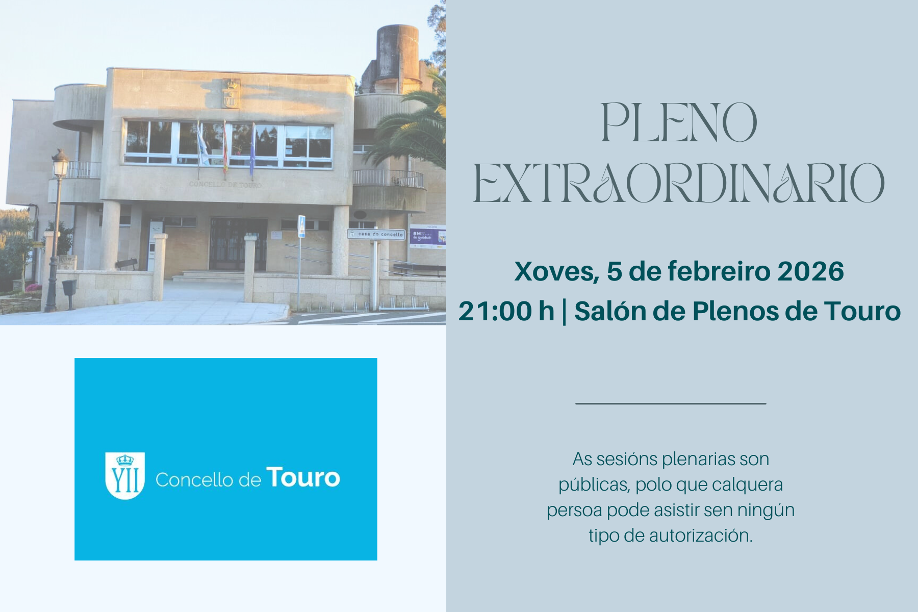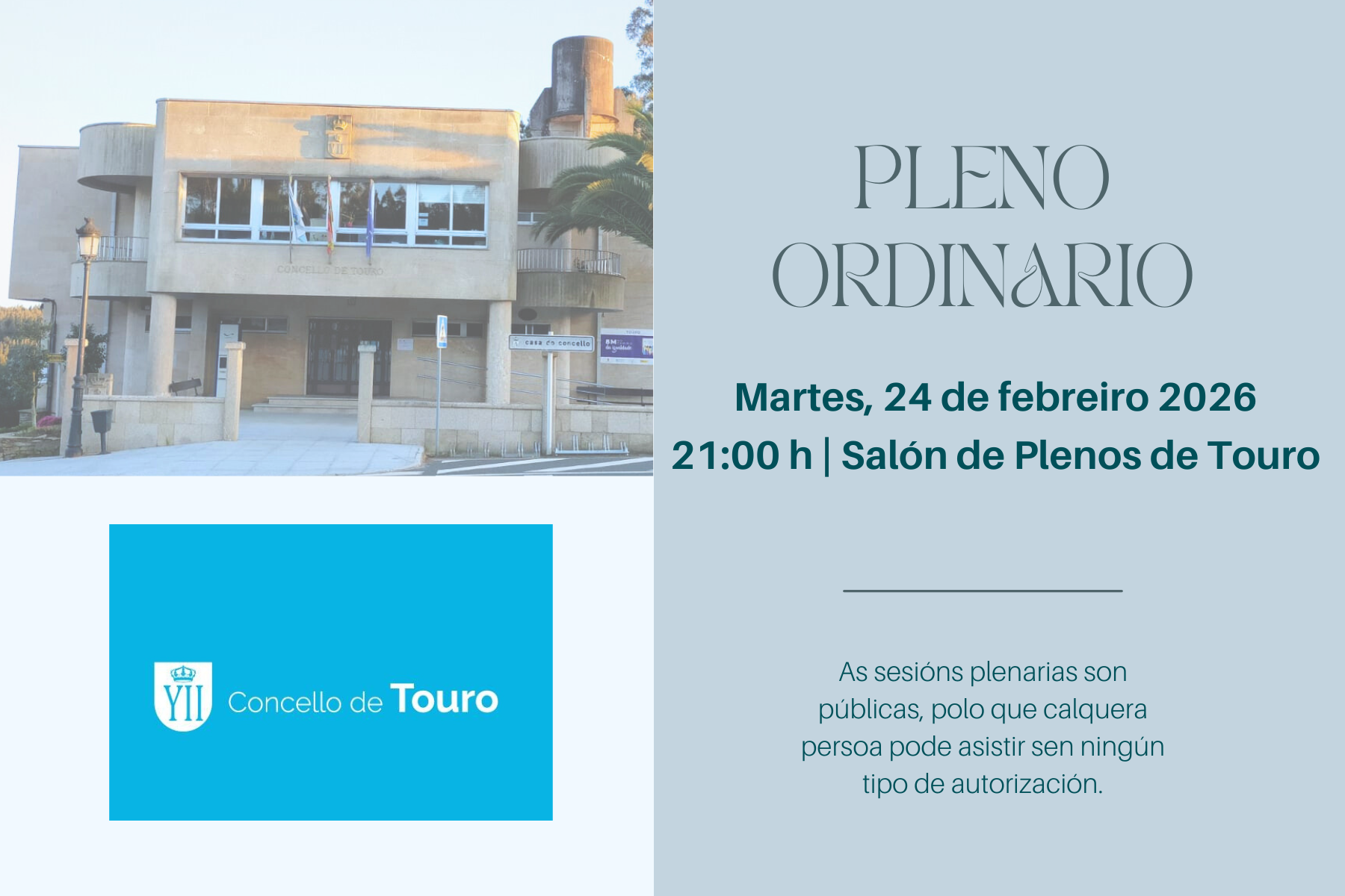 A Corporación Municipal de Touro celebrará hoxe, martes 24 de febreiro, o pleno ordinario deste mes. Será ás 21 horas e tamén se pode seguir en directo a través da canle de YouTube do Concello. Compartimos enlace: https://www.youtube.com/live/XQK7rnAOF9s
