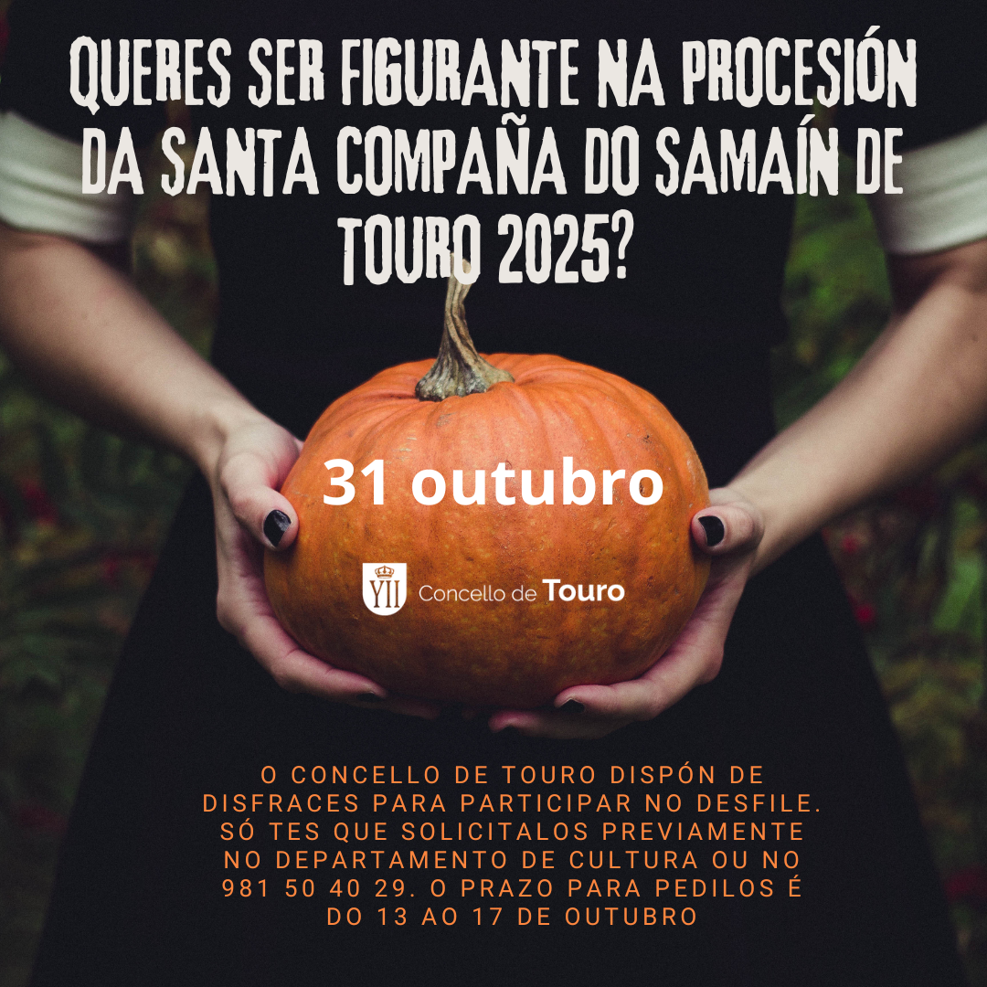 O Concello de Touro celebrará un ano máis o 31 de outubro a procesión da Santa Compaña do Samaín. Queres participar como figurante da procesión? O Concello de Touro dispón de disfraces para participar no desfile. Para solicitalos chama dende mañá, luns 13 ao 17 de outubro ao departamento de Cultura a través do 981 504 029.
