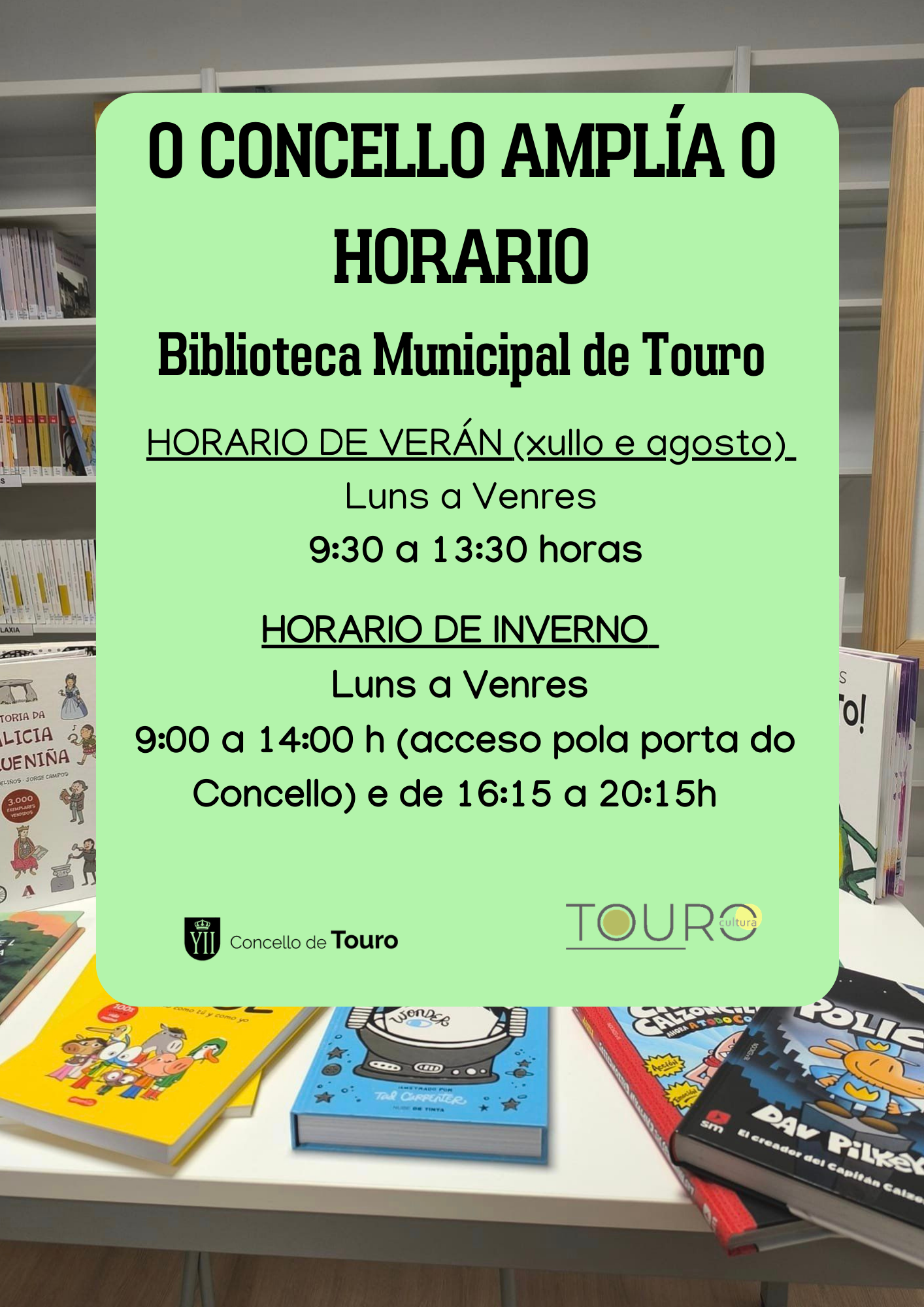 O CONCELLO DE TOURO AMPLÍA O HORARIO DA BIBLIOTECA MUNICIPAL