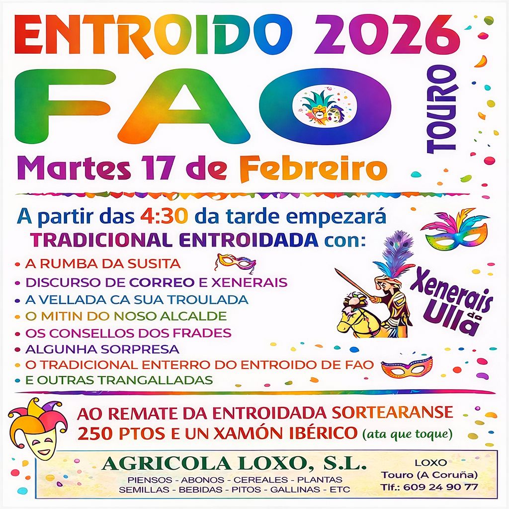 Este sábado 14 de febreiro, celebramos o Entroido en Fonte Díaz organizado polo Concello. Repartimos 2.000 euros en premios, recoñecendo o esforzo, a imaxinación e o bo humor das persoas participantes. Ademais tampouco faltaron a boa música, os Xenerais da Ulla e a degustación de produtos típicos desta época. Grazas a todas e todos por facer do Entroido unha festa inesquecible. Nas redes sociais do Concello de Touro podedes ver todas as fotos desta celebración.&nbs(...)