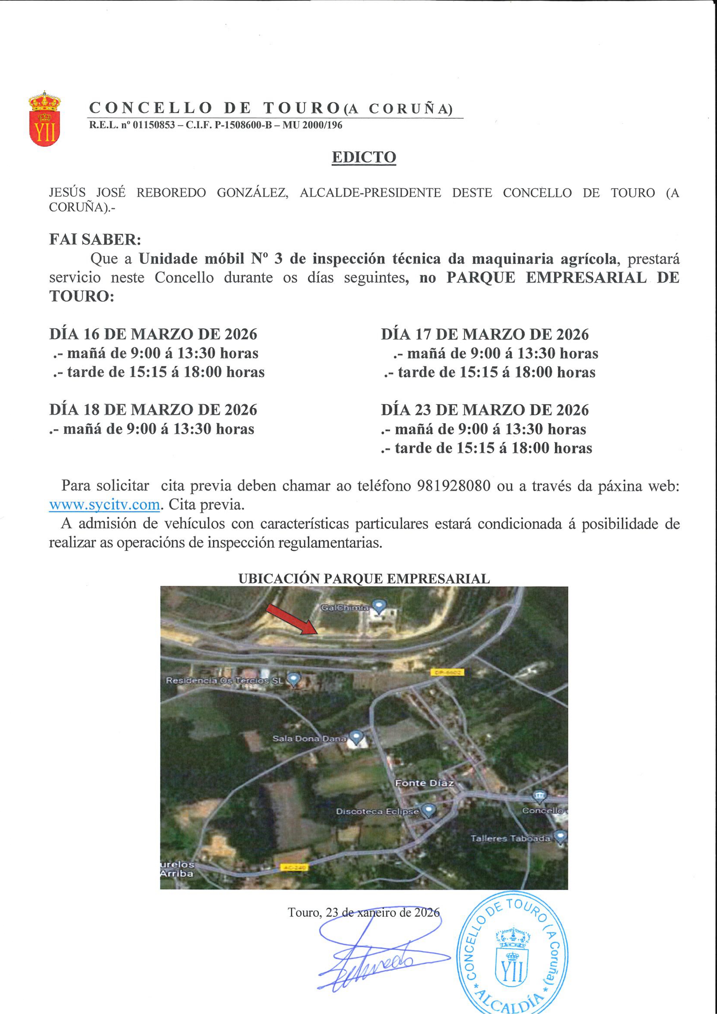 INSPECCIÓN TÉCNICA DE MAQUINARIA AGRÍCOLA EN TOURO2026-01-23 15:30:47Desenvolvemento LocalA unidade móbil nº 3 de inspección técnica da maquinaria agrícola estará no parque empresarial de Touro no mes de marzo. Lembren que é necesario pedir cita previa. Adxuntamos cartel con toda a información.