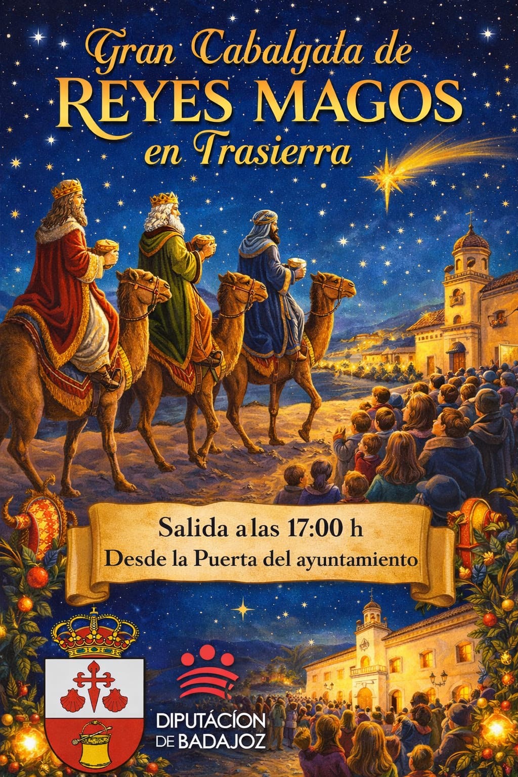 Se informa a todos los vecinos y vecinas que la Cabalgata de los Reyes Magos tendrá lugar hoy, saliendo a las 17:00 horas desde el Ayuntamiento.