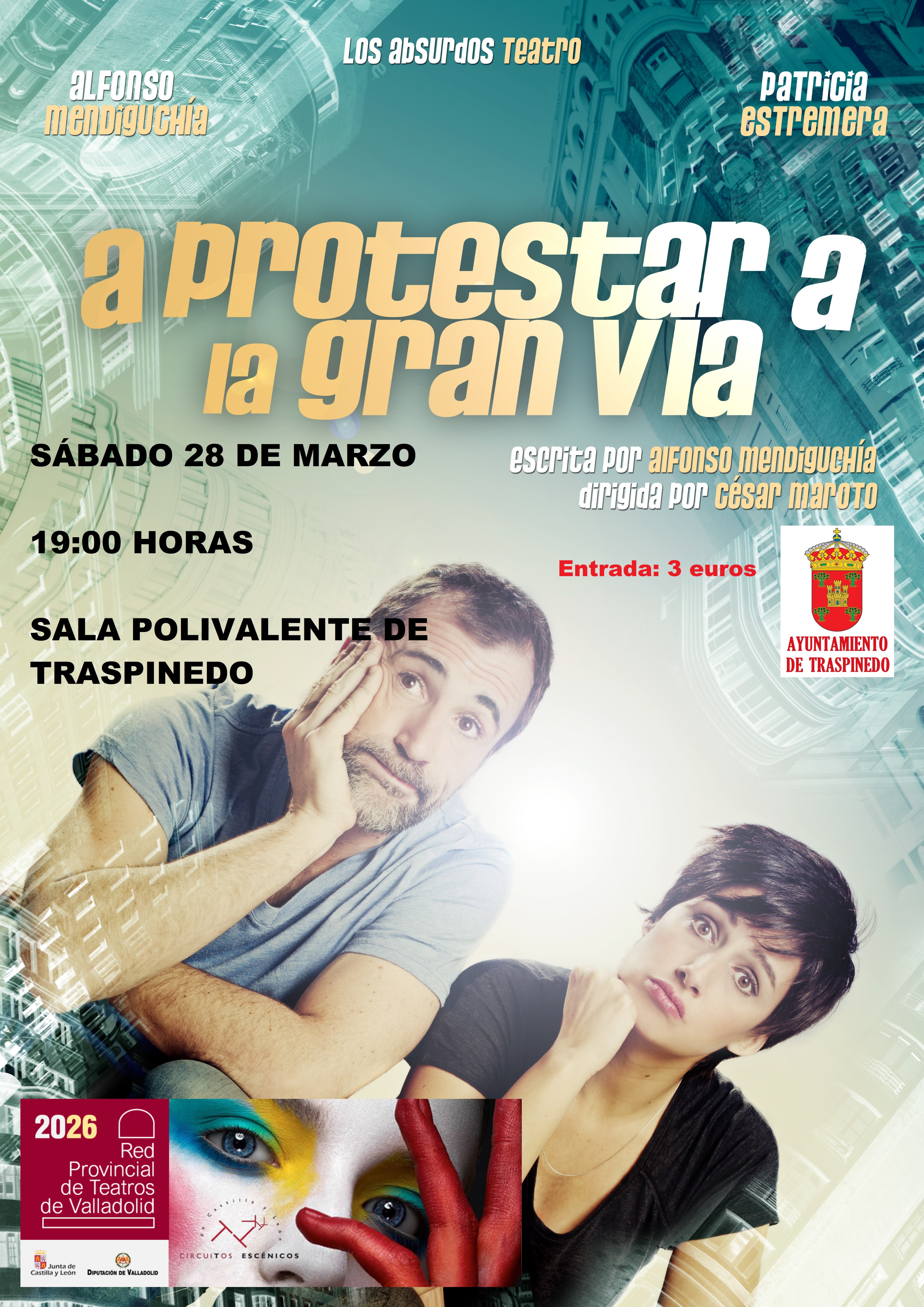 Los Absurdos Teatro presenta este sábado 28 de marzo en Traspinedo 'A protestar a la Gran Vía', obra que se ha convertido en una de sus más emblemáticas, reconocida por crítica y público como una pieza definitoria de su estilo y manera de contar las cosas. Premio al MEJOR ACTOR Festival Nacional de Teatro Vegas Bajas 2019.