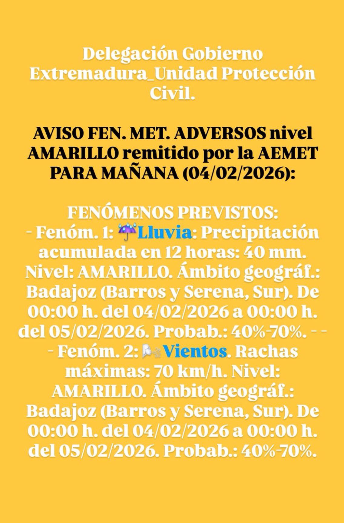 Delegación Gobierno Extremadura_Unidad Protección Civil. AVISO FEN. MET. ADVERSOS nivel NARANJA remitido por la AEMET PARA MAÑANA (05/02/2026) (RECIBIDO A LAS 11:14 HORAS DEL 4/02/2026): FENÓMENOS PREVISTOS: Fenóm. 1: Lluvia: Precipitación acumulada en 12 horas: 80 mm. Nivel: AMARILLO. Ámbito geográf.: Cáceres (Norte). De 00:00 h. a 18:00 h. del 05/02/2026. Probab.: 40 %-70%. Comentario: No se descarta que se puedan alcanzar los 100 o 120 litros en algunos puntos en 24 horas.
