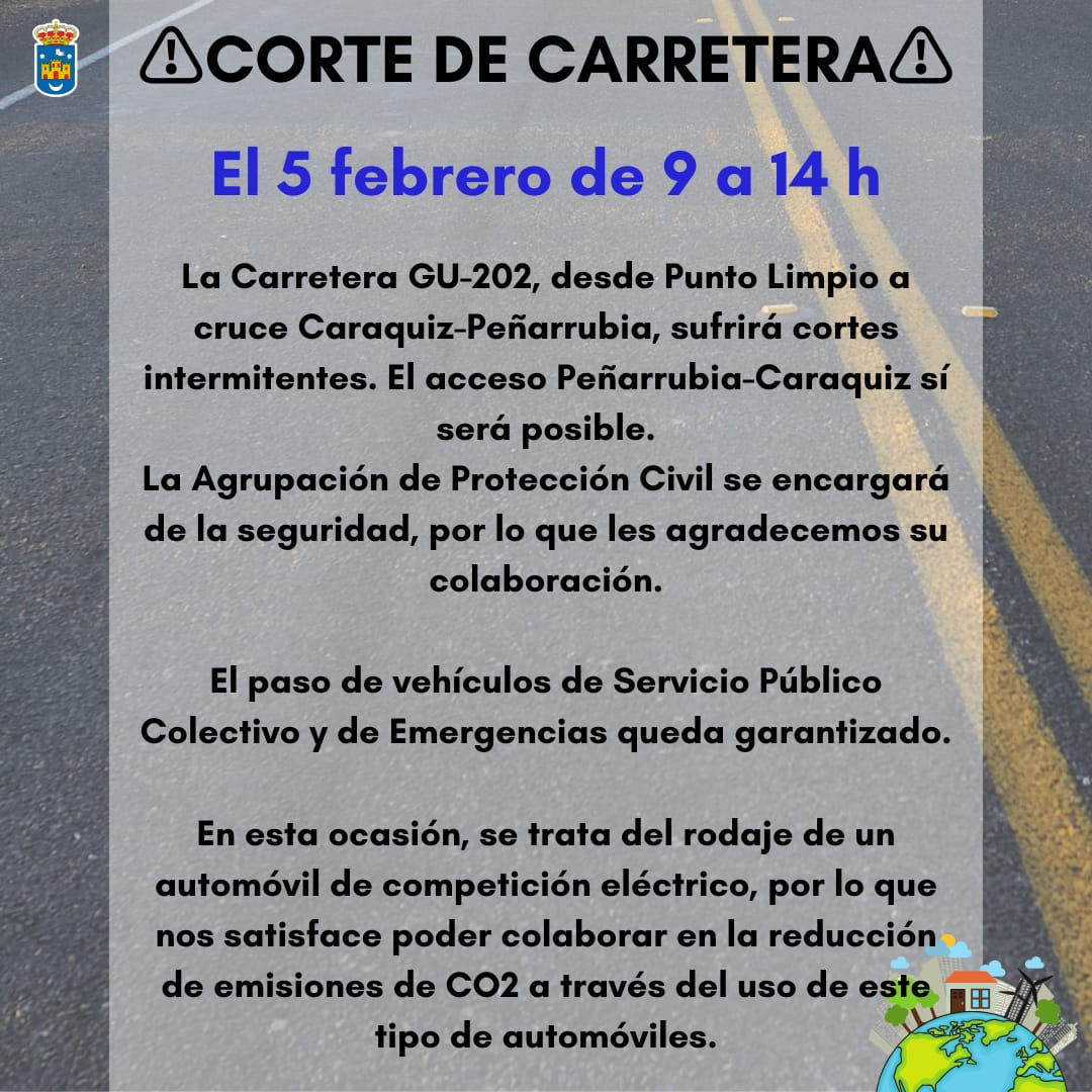 La Carretera GU-202, desde Punto Limpio a cruce Caraquiz-Peñarrubia, sufrirá cortes intermitentes. El acceso Peñarrubia-Caraquiz sí será posible.