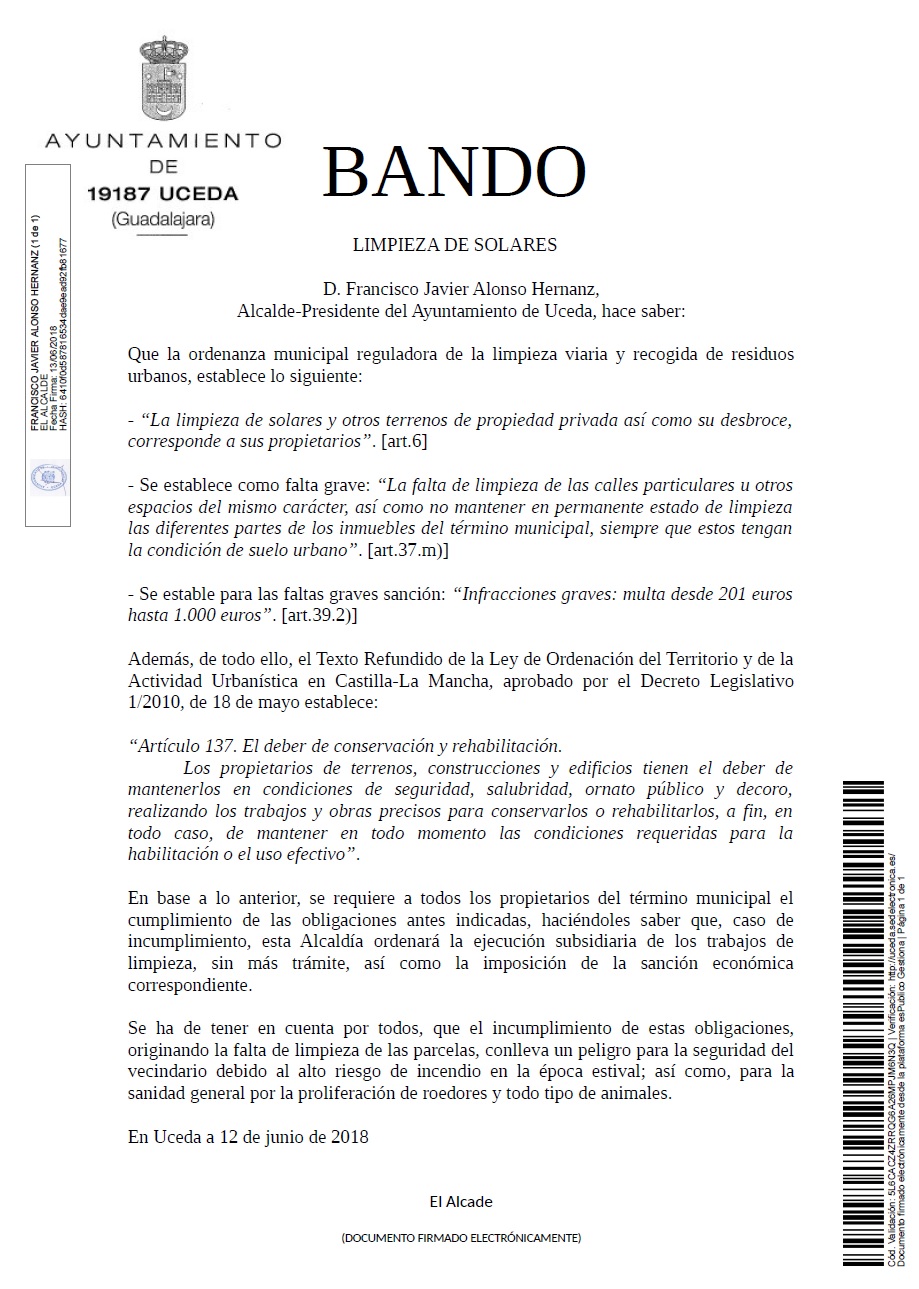 Bando: Limpieza de solares2018-06-13 13:22:28Info GeneralD. Francisco Javier Alonso Hernanz, Alcalde-Presidente del Ayuntamiento de Uceda, hace saber: