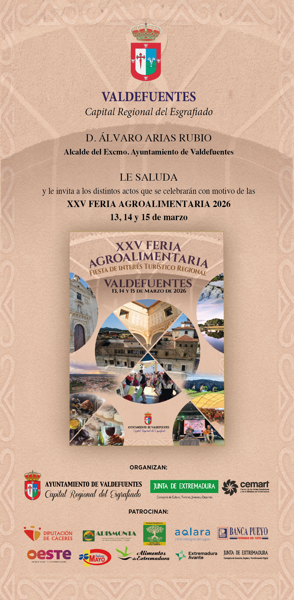 Buenos días, os adjuntamos saluda e invitación a la XXV Feria Agroalimentaria que se celebrará los próximos días 13, 14 y 15 de marzo, y que como sabéis fue declarada el pasado mes de septiembre por la Junta de Extremadura como Fiesta de Interés Turístico Regional, lo que sin duda significa un reconocimiento a la suma de muchas voluntades (empresas expositoras, empresas e instituciones, colaboradoras, trabajadores del Ayto.,etc.) y una justa recompensa a 25 años de trabajo, de ilusión, de in(...)
