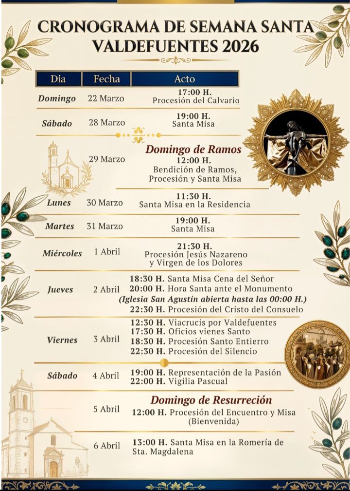 Buenas días, os adjuntamos cartel que nos remite nuestra Parroquia con las distintos actos religiosos que se celebrarán durante esta Semana Santa, en ellos aparece el sábado 4 la representación de la Pasión, que este año a pesar de los esfuerzos realizados por la Asociación la Pasión Viviente de Valdefuentes para encontrar una solución ante la falta de dos de los personajes más importantes no se podrá llevar a cabo. Feliz Semana Santa para todos.