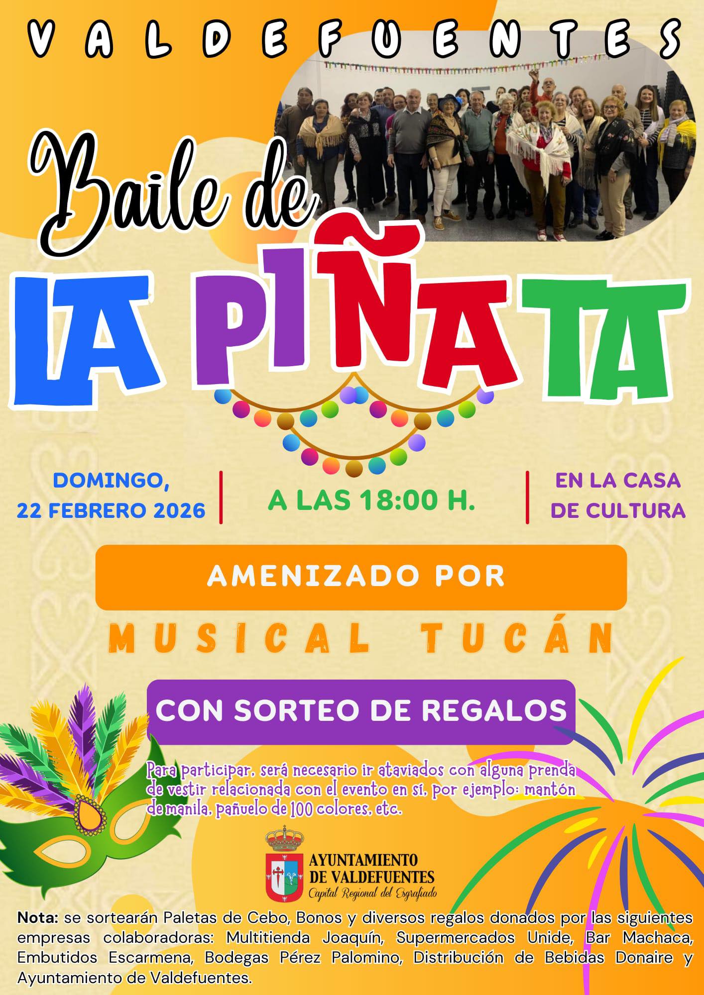 El próximo domingo 22 de febrero se celebrará a partir de las 18:00 en la Casa de Cultura amenizado por Musical Tucán el tradicional Baile de la Piñata, con arreglo a los siguientes requisitos: