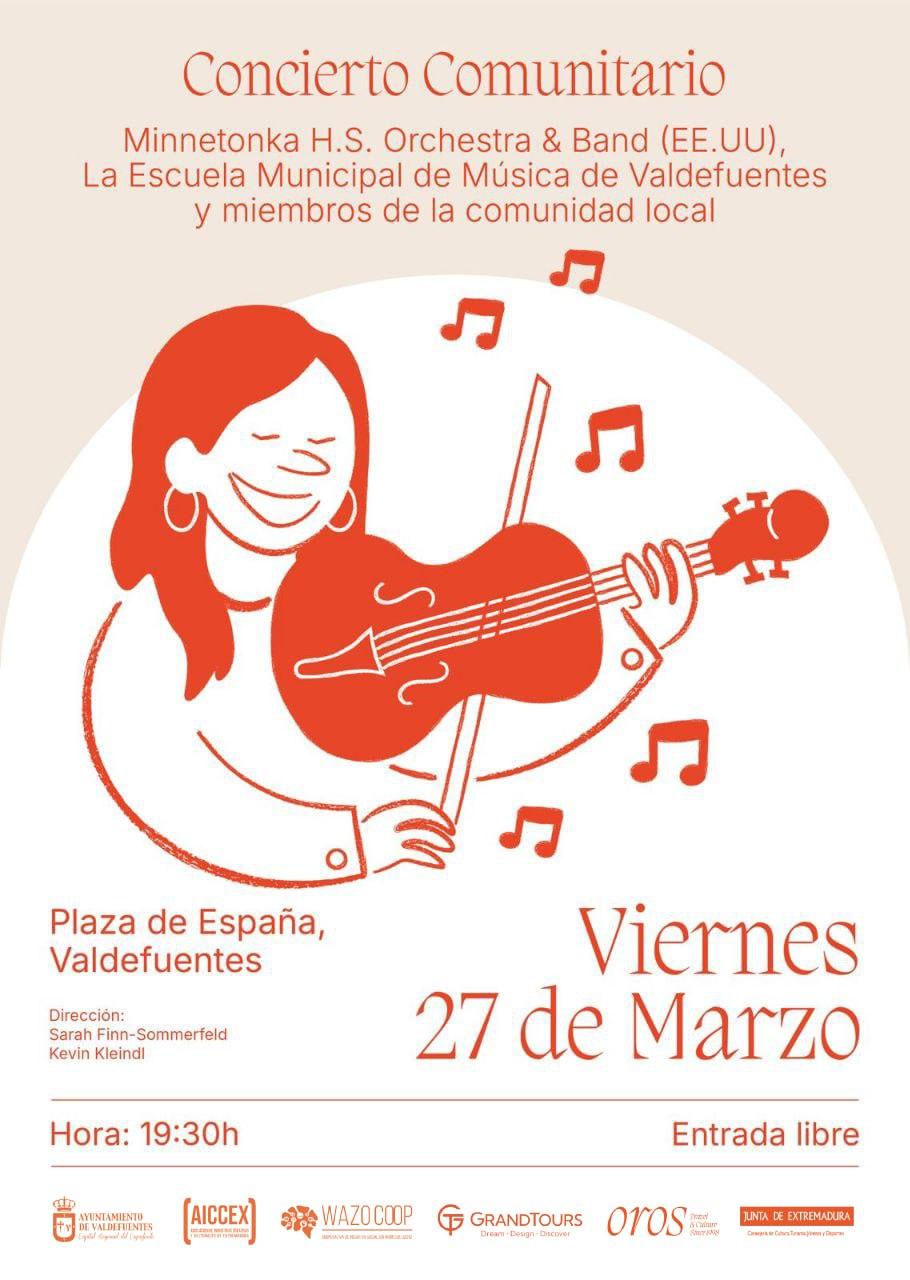 El próximo viernes 27 de marzo Valdefuentes acogerá un gran concierto comunitario que nos ofrecerá la Minnetonka High School Orchestra & Band (Minnesota, EEUU) en la Plaza de España de nuestra localidad, en el que participarán más de 100 alumnos procedentes de dicha Escuela americana, que interactuarán con alumnos de la Escuela municipal de Música San Agustín de Valdefuentes y Vecinos de la localidad.