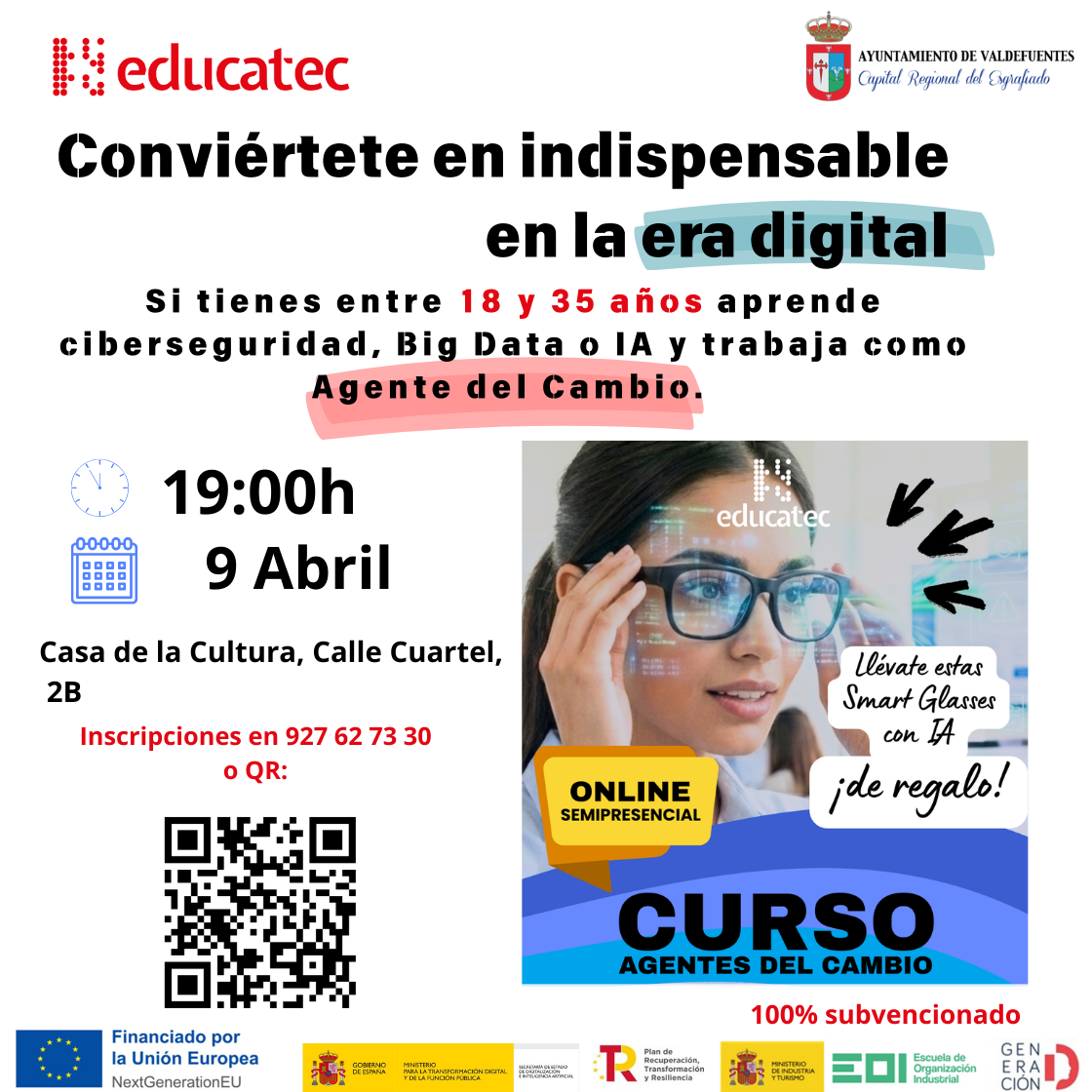 Buenas tardes, a través de Educatec con la colaboración del Ayuntamiento y diversas Instituciones y financiado por la Unión Europea (Fondos Next Generation) se va a impartir en nuestra localidad un Curso de Agentes del Cambio para personas entre 18 y 35 años que estén en posesión del título de Bachiller, FP, Grado Medio y/o Universitario, o que estén en el último curso de dichas titulaciones. A quienes estuvieran interesados les convocamos a una reunión el próximo jueves 9 de abril en la Casa de(...)
