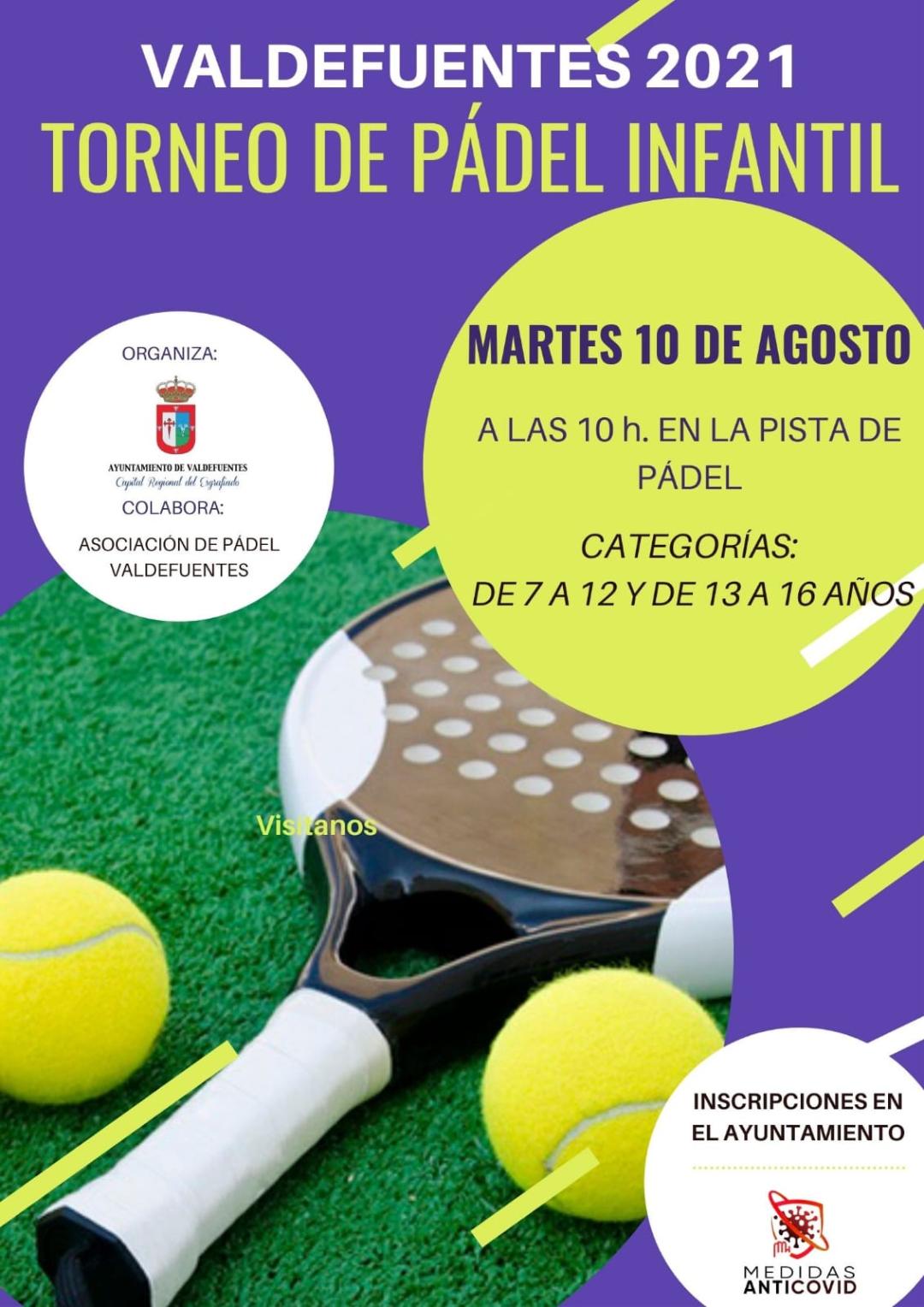 Torneo infantil de pádel2021-07-16 11:37:03DeporteOs adjuntamos cartel indormativo del torneo Infantil de Pádel, organizado por el Ayuntamiento, en el que colabora la Asociación Pádel Valdefuentes, y que se celebrará el próximo 10 de Agosto, con todas las medidas y normas anti covid establecidas y cuyo plazo de inscripción permanecerá abierto desde las 9:00 horas del lunes 19 de Julio hasta las 14:00 del dia anterior a la celebración de dicho torneo, en las oficinas del Ayuntamiento.
