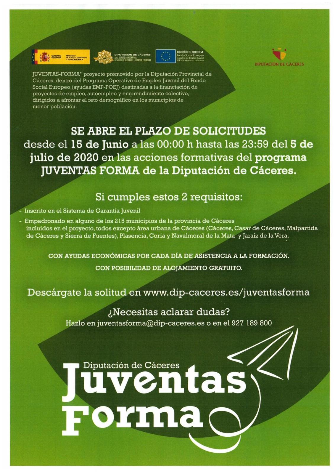 Cursos del proyecto “Juventas Forma” de la Diputación de Cáceres2020-06-18 10:08:46Info GeneralSe trata de acciones formativas destinadas a personas de entre 16 y 30 años, que no estudien ni trabajen en estos momentos, con el fin de ayudarles a la integración laboral en municipios de la provincia. Los jóvenes interesados deberán estar inscritos en el Sistema de Garantía Juvenil el día antes del inicio de la acción formativa.