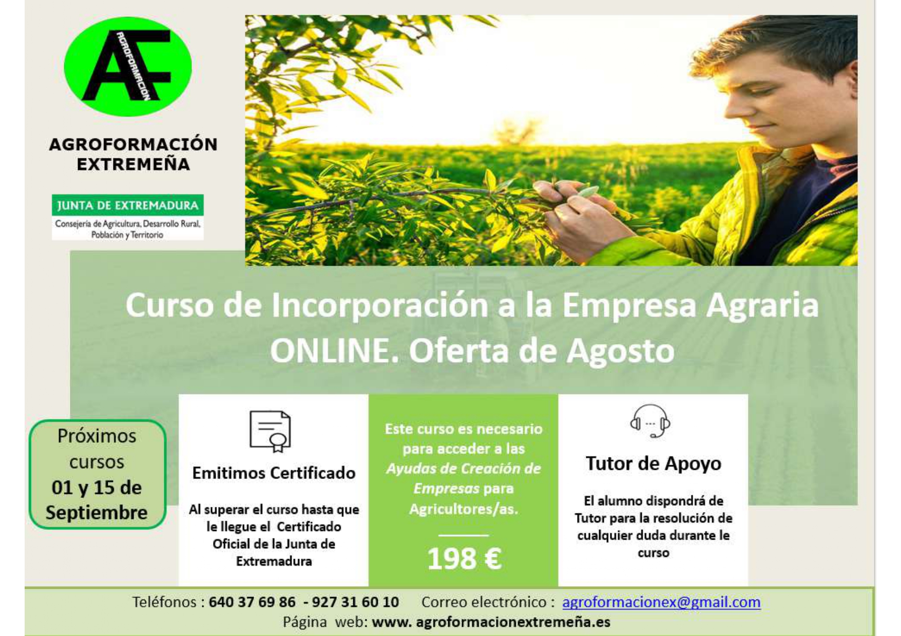 Promoción inicio para el mes de Septiembre en cursos de INCORPORACIÓN A LA EMPRESA AGRARIA ONLINE, para Jóvenes Agricultores y Ganaderos Extremeños, por tan solo 198 €. Mantenemos los precios.