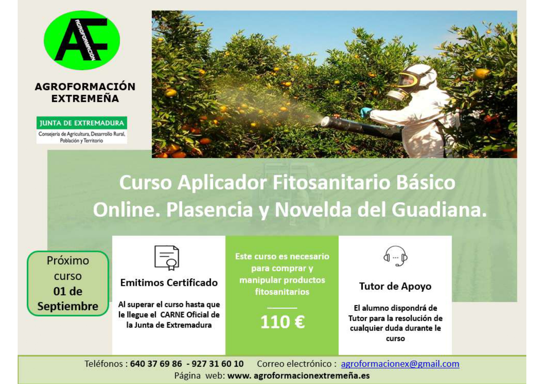También disponemos para el día 01 de Septiembre el curso de Aplicador de Productos Fitosanitarios Online. Nivel Básico en Plasencia y Novelda del Guadiana.