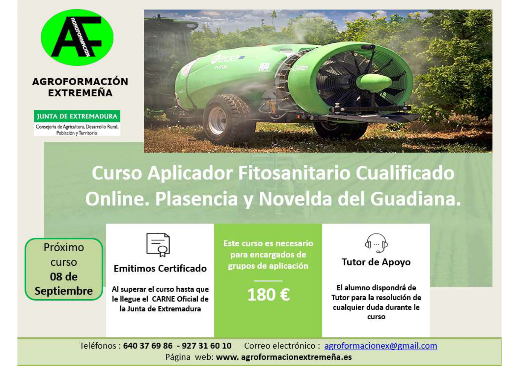 También disponemos para el día 08 de Septiembre el curso de Aplicador de Productos Fitosanitarios Online. Nivel Cualificado en Plasencia y Novelda del Guadiana.